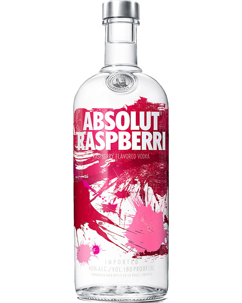 Vodka aromatizzata a marchio Absolut utilizzando lamponi da raccolte selezionate senza zuccheri aggiunti.