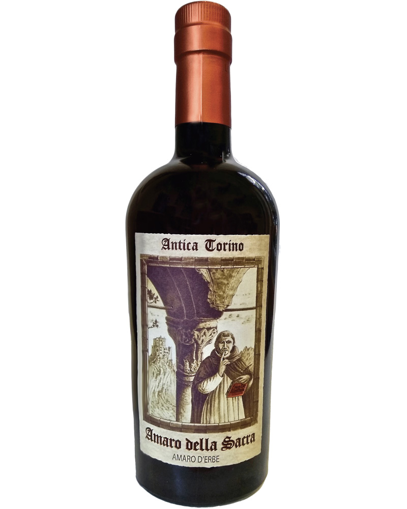 Amaro alle erbe prodotto da Azienda Antica Torino, fondata da Vittorio Zoppi e Filippo Antonelli seguendo un’antica ricetta piemontese. L’immagine in etichetta richiama l’imponente Basilica, la sua storia ed antiche tradizioni dei monaci che rivivono oggi in questo Amaro. L’amaro della Sacra è prodotto macerando in alcol per circa 45 giorni (originato da grano 96 proof e poi portato con acqua a 35%) solamente ingredienti naturali quali: semi di Cardamomo verde e bacchette di Cannella delle Indie, baccelli di Vaniglia bourbon del Madagascar, resina di Mirra del Medio Oriente, fusto di Quassio del Sud America, corteccia di China Succirubra (rossa, la più pregiata e costosa) del Sud America, fiori di Genzianella e fiori di Luppolo, entrambi del Piemonte.