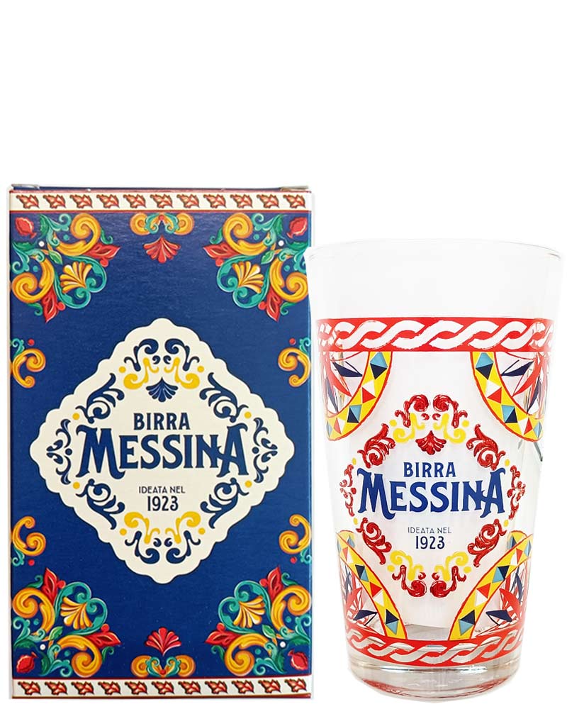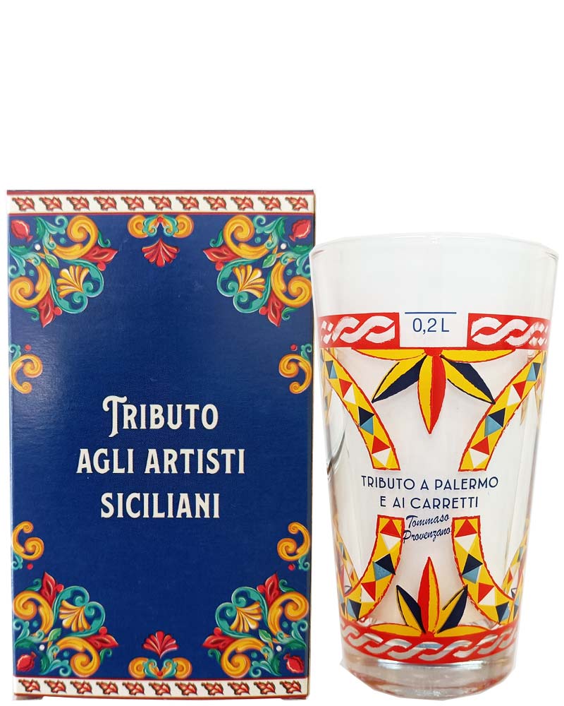 Bicchiere tributo ai Carretti palermitani, in vetro con miniature dell’artista Tommaso da Provenzano. Il bicchiere rientra nella collezione di bicchieri “Tributo agli artisti Siciliani” di Birra Messina, realizzati con il contributo di grandi artisti del territorio siculo, in omaggio a paesi ed eventi dell’isola italiana.