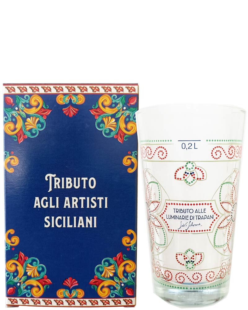 Bicchiere tributo alle meravigliose Luminarie di Trapani con miniature dell’artista Salvatore Scherma. Il bicchiere rientra nella collezione di bicchieri “Tributo agli artisti Siciliani” di Birra Messina, realizzati con il contributo di grandi artisti del territorio siculo in omaggio a paesi ed eventi dell’isola italiana.