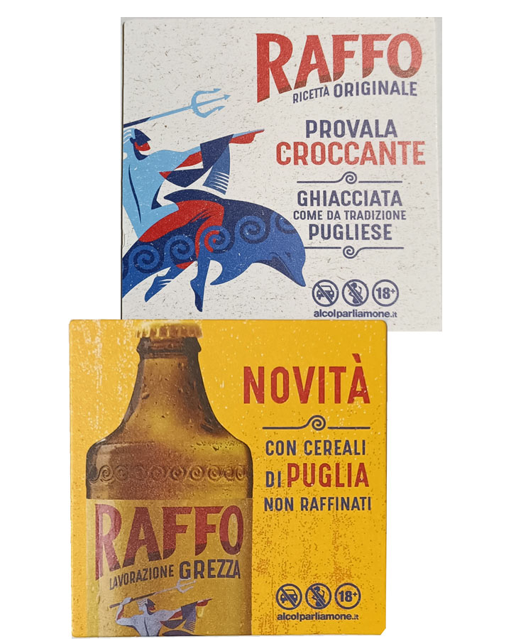 Confezione di sottobicchieri originali Birra Raffo con doppia grafica fronte e retro. Cartone rigido per un migliore servizio.