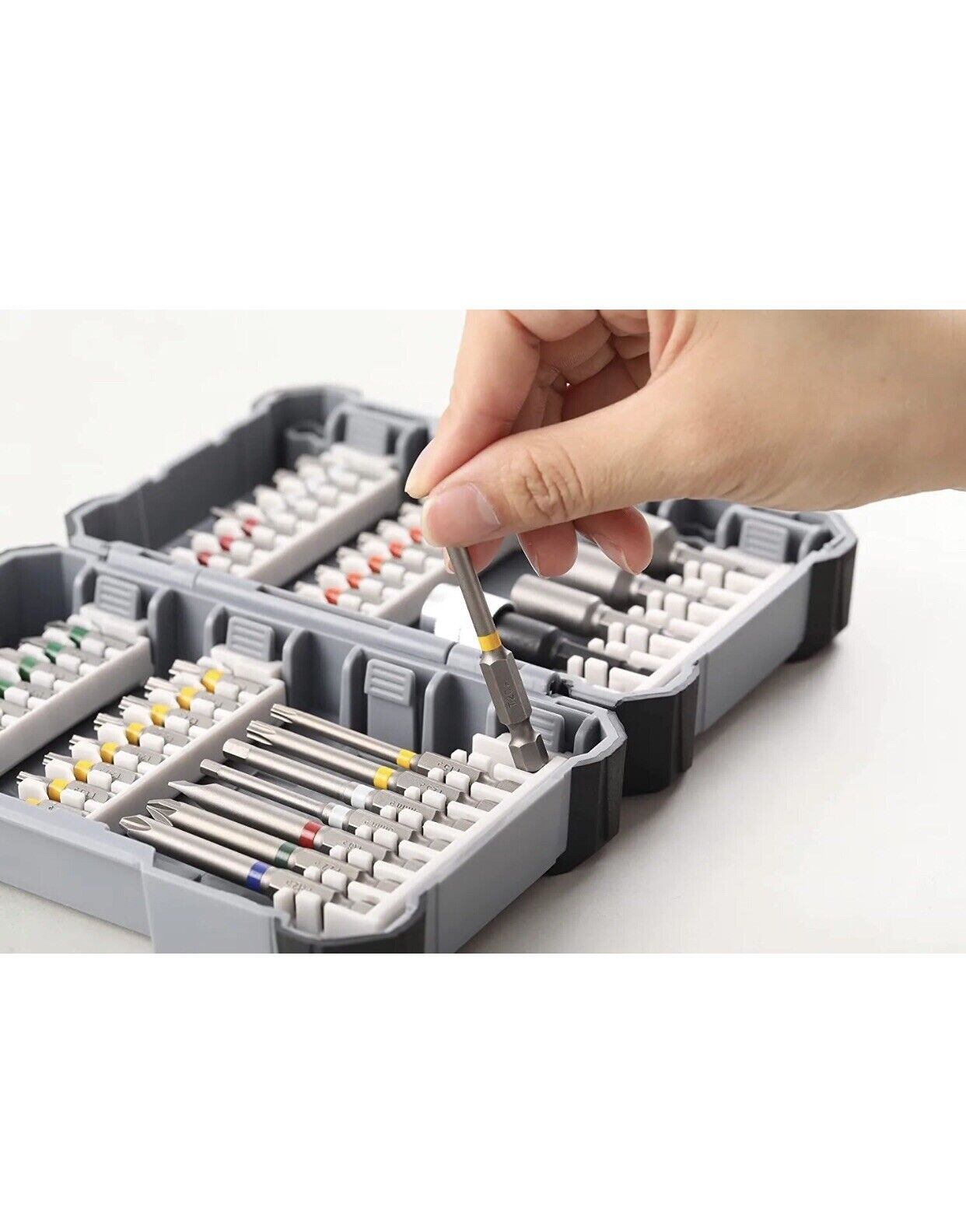 - Sistema a scatto: i pacchetti di bit vengono bloccati saldamente negli slot a scatto ed è sufficiente premere la linguetta di rilascio per rimuoverli e sostituirli.