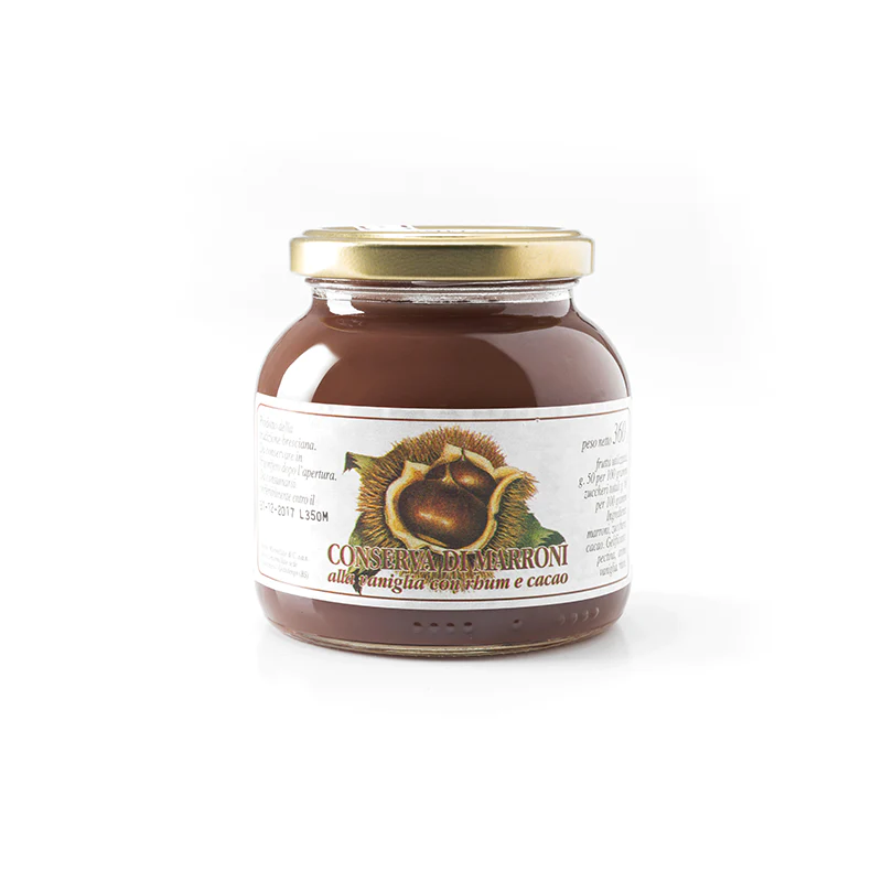 Ingredienti: marroni,zucchero, cacao, gelificante: pectina, estratto di vaniglia (0,03%), aroma: rhum.
