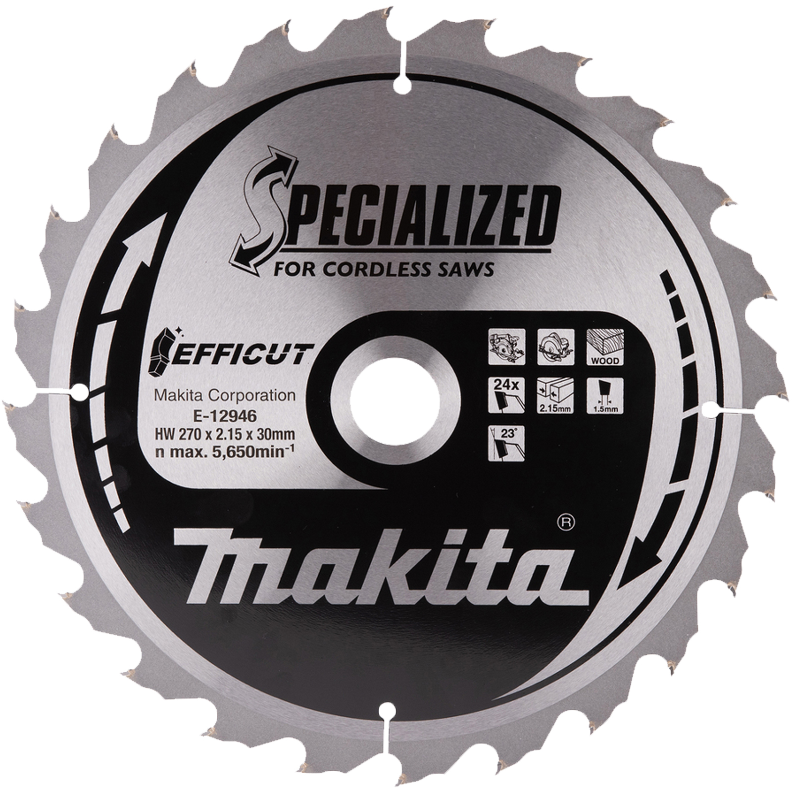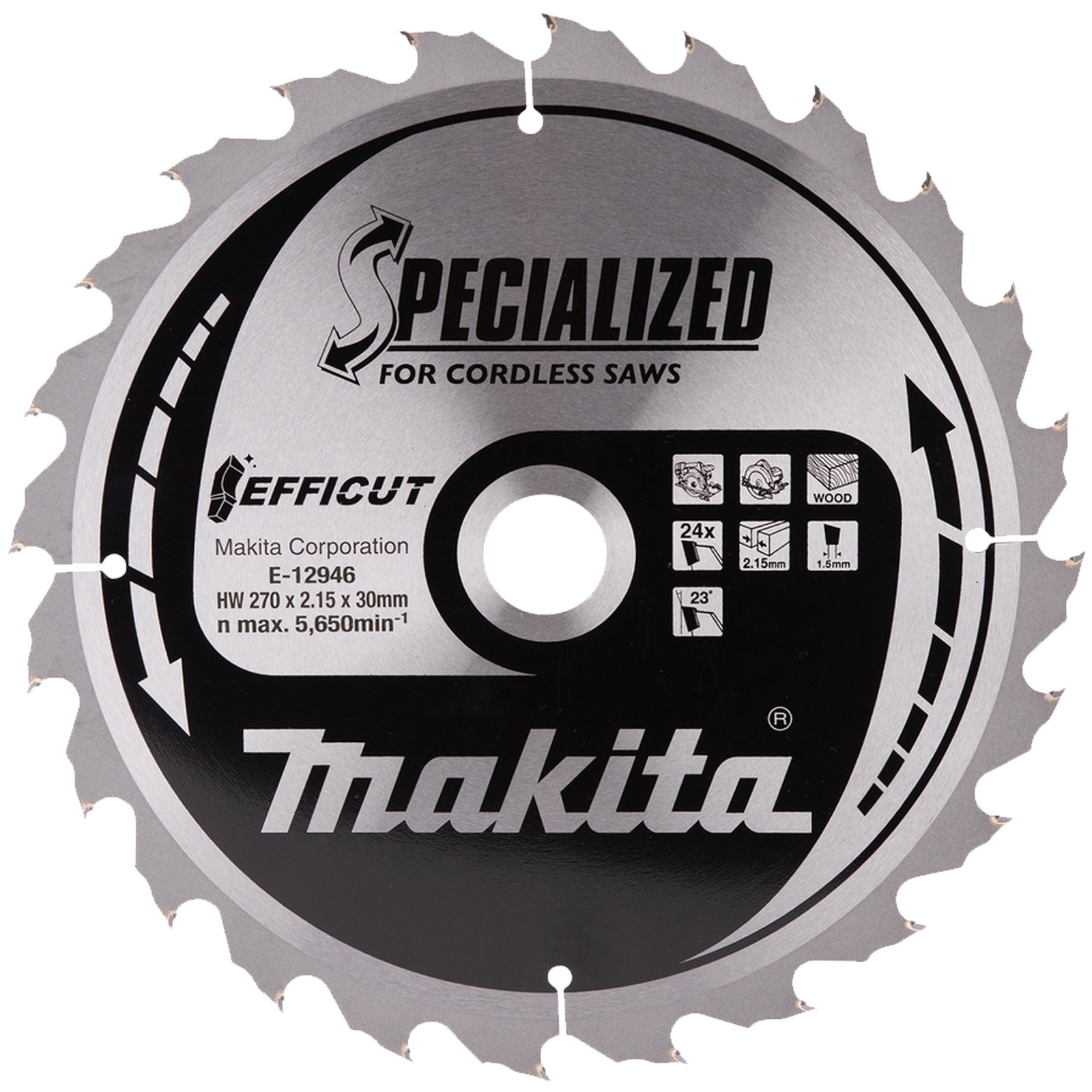 Il disco da taglio dallo spessore sottile e la composizione extra dura ha un diametro di 270 mm ed un foro da 30 mm, presenta 24 denti Efficut per tagli rapidi e puliti.