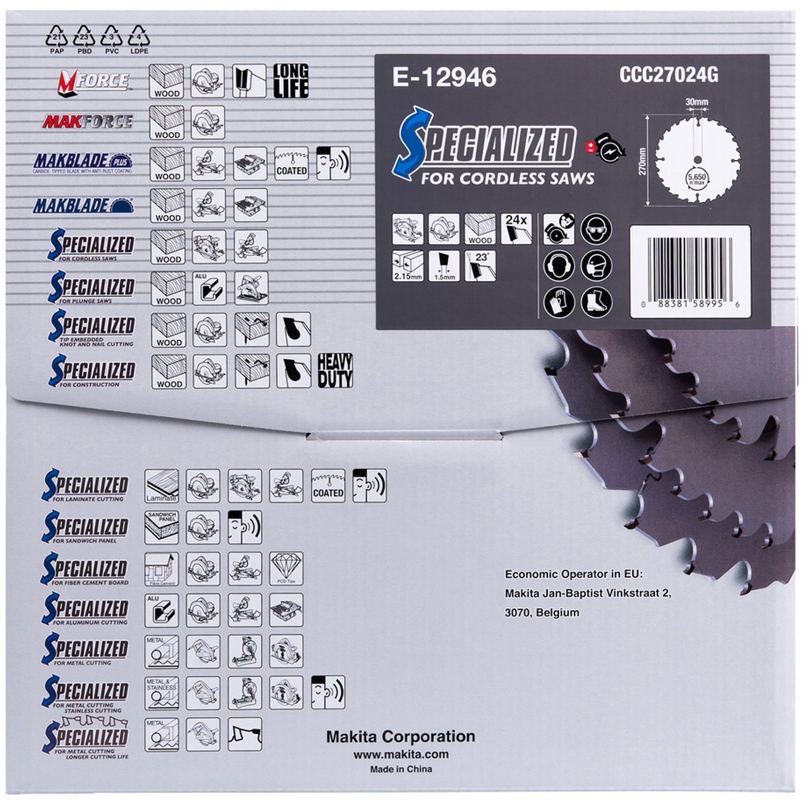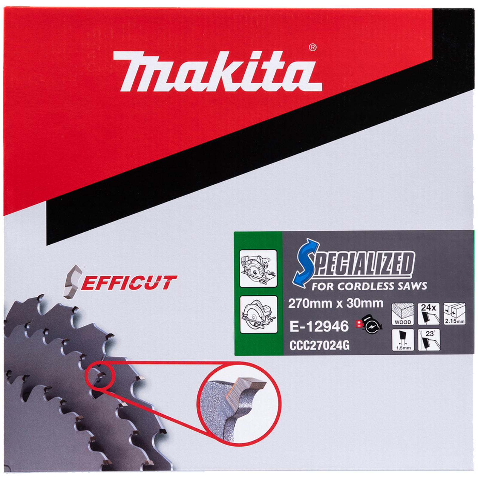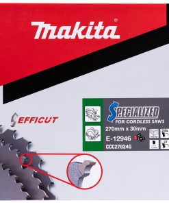 Il disco da taglio TCT per legno da 270×30 mm della Makita modello E-12946 della gamma Efficut è un’ottimo accessorio per la sega circolare ideale per realizzare tagli estremamente rapidi e veloci.