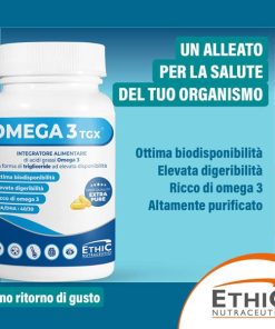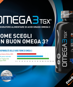 OMEGA 3 TGX® è una fonte concentrata e purificata di acidi grassi della serie OMEGA 3, con elevato tenore in EPA e DHA. Gli acidi grassi presenti in OMEGA 3 TGX® (compresi i principi attivi EPA e DHA) sono concentrati come trigliceridi, forma altamente biodisponibile. Il processo di purificazione segue standard molto elevati, garantendo un prodotto purificato e facilmente digeribile che non presenta ritorno di gusto. La presenza dell’estratto ricco di Tocoferolo contrasta l’ossidazione e ne preserva l’integrità. [VivoMegaTM TG60 è una materia prima di qualità elevata certificata seguendo protocolli internazionali-IFOS]