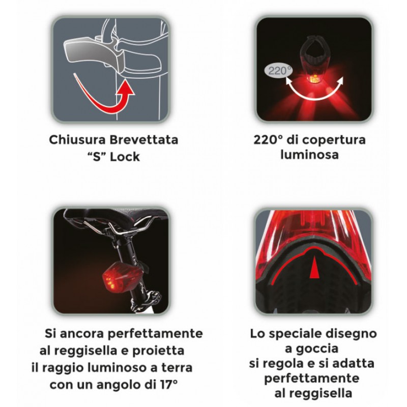 - Lo speciale disegno a goccia si regola e si adatta perfettamente al reggisella