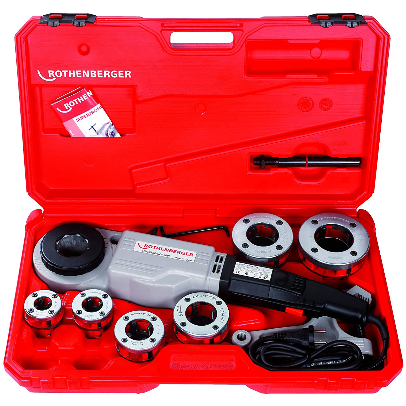 La Supertronic 2000 di Rothenberger è una filettatrice ad azionamento elettrico portatile con una potenza di 1010 Watt caratterizzata da una struttura in alluminio compatta che le consente di operare anche in luoghi ristretti e di difficile accesso come possono essere pozzi o angoli.