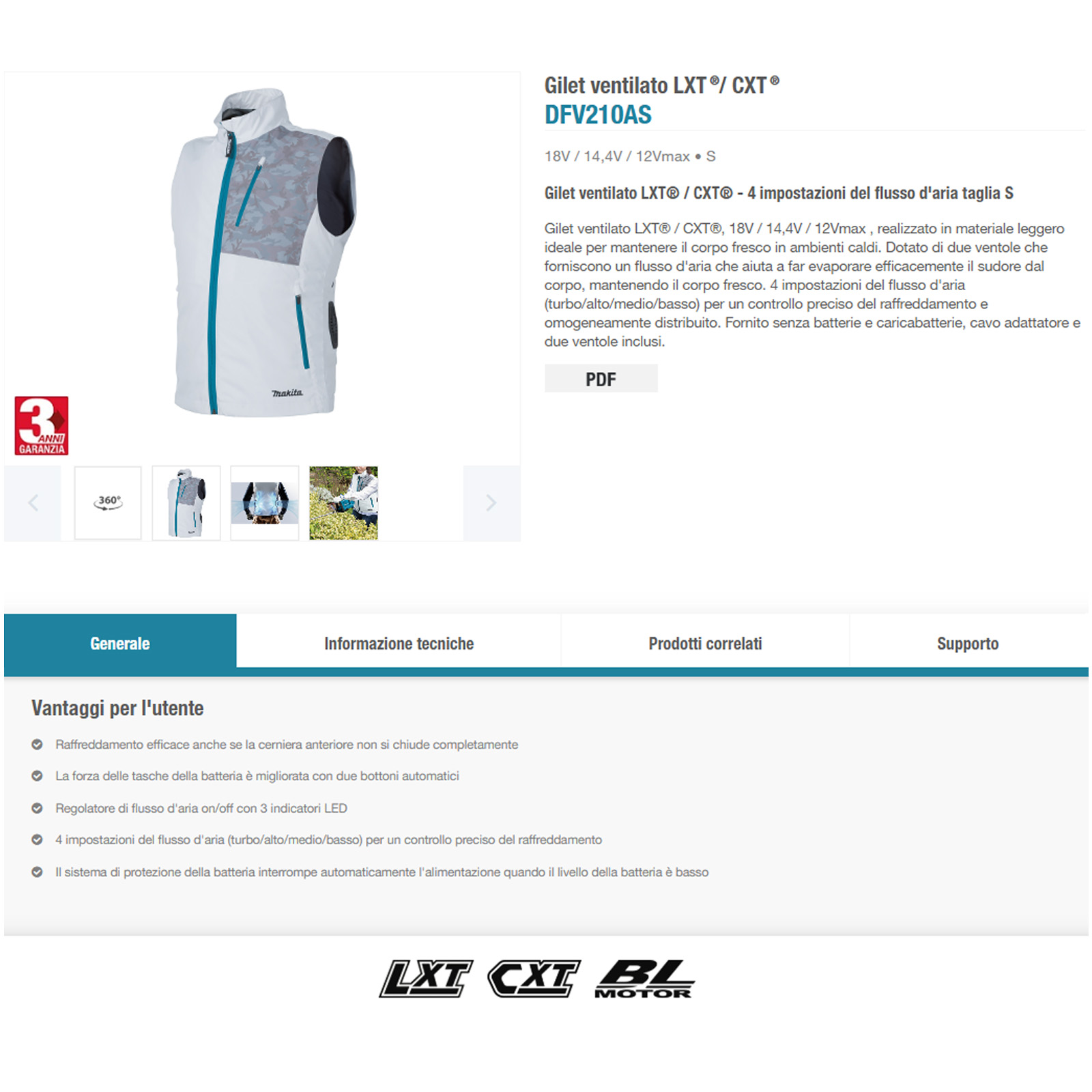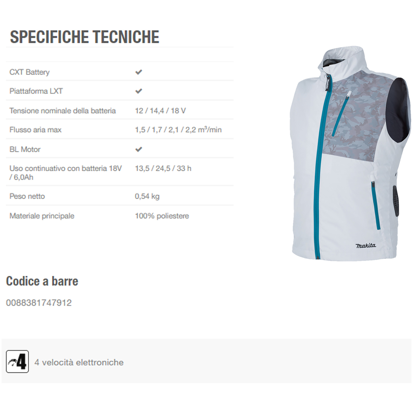 Il gilet è compatibile con le piattaforme batteria Makita LXT® (18V), CXT® (14,4V) e 12Vmax, garantendo così una grande flessibilità di utilizzo con diversi modelli di batterie Makita (non incluse – da acquistare separatamente).
