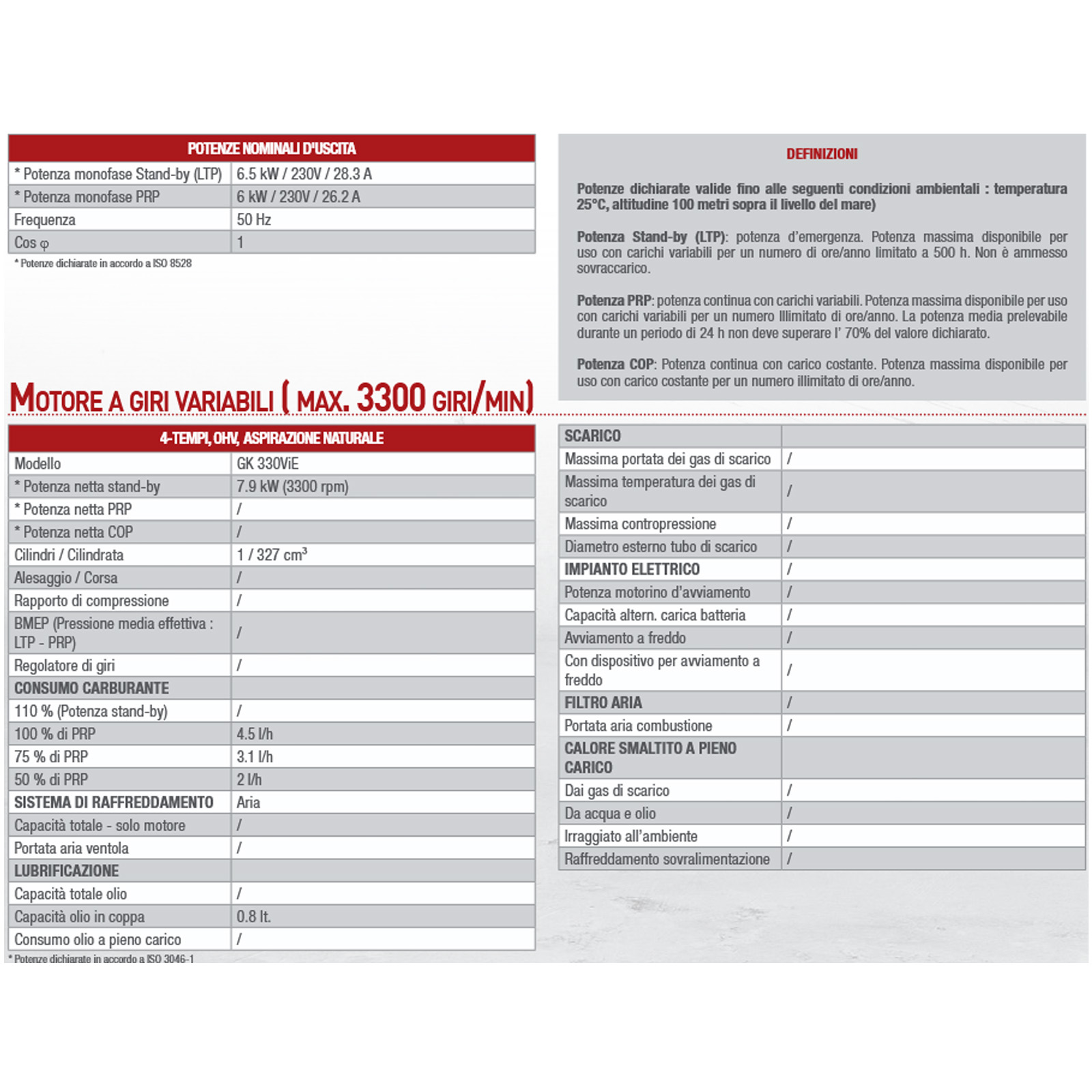 Con un regime di 3300 giri al minuto, questo motore eroga una potenza massima di 6,5 kW in Stand-by e 6 kW in PRP, sufficiente per alimentare elettroutensili, sistemi di illuminazione, elettrodomestici e dispositivi elettronici sensibili come computer e apparecchi medicali.