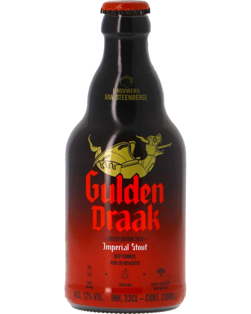 Birra scura Imperial Stout, la più forte per gradazione alcolica (12°) del marchio Gulden Draak del birrificio Van Steenberge nella città belga di Gand. Il tipico gusto arrosto si ottiene aggiungendo malto tostato e caramellato che viene utilizzato esclusivamente per questo e si utilizza una fermentazione secondaria che intensifica la forza alcolica. Il nome Gulden Draak è la traduzione fiamminga del nome “Golden Dragon”, ovvero “dragone dorato”. La birra infatti porta questo nome in onore del drago dorato che orna il campanile della città.