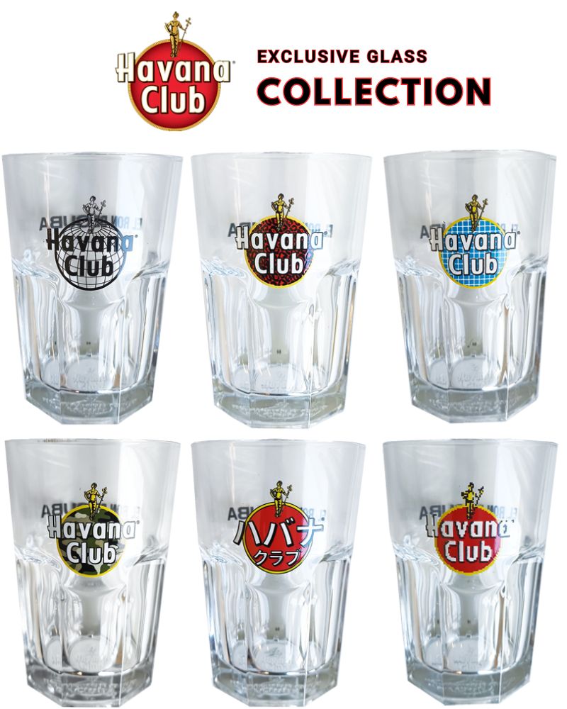 Collezione di sei diverse varianti di bicchieri Havana Club in vetro con grafiche esclusive.