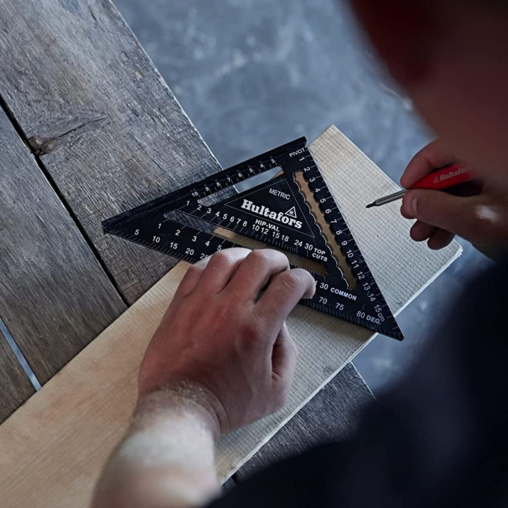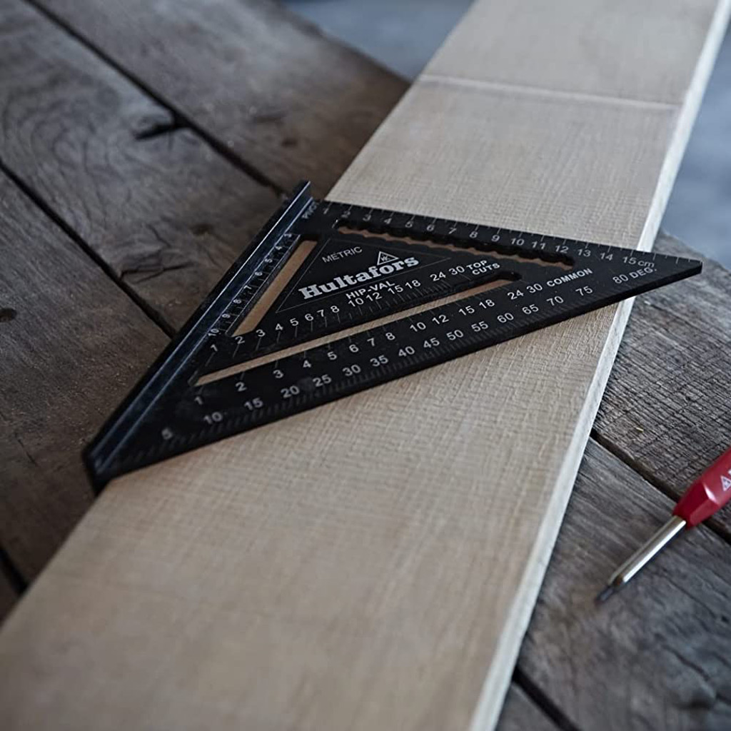 La squadra da carpentiere Hultafors 257010 MR 18cm è uno strumento estremamente versatile per tutti gli artigiani. Si può utilizzare per marcature di precisione a 45° e 90°. Funge anche da goniometro per misurare e marcare facilmente altri angoli comuni. Inoltre il suo bordo spesso e robusto è utile come guida quando si lavora con una motosega, per tagli a 45° e 90°, con una certa destrezza o con un morsetto anche per tagli ad altre angolazioni. Le tacche di marcatura consentono di utilizzarla anche indirettamente per tracciare una linea a matita o per tagliare pannelli in cartongesso con un coltello. Hultafors 257010 MR 18cm è dotata di scale originali per il taglio di travi d’angolo, di campata e di tetti a padiglione.