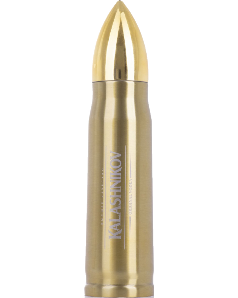 Esclusivo thermos per bevande calde e fredde realizzato da Kalashnikov replicando la forma del proiettile dell’omonimo fucile d’assalto. Oggetto fantastico per gli amanti delle armi o per chi ama i prodotti da collezione. Rivestito di metallo color oro, può contenere 50 cl di liquidi.