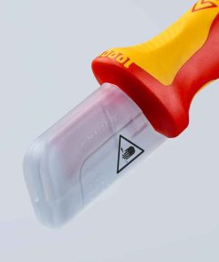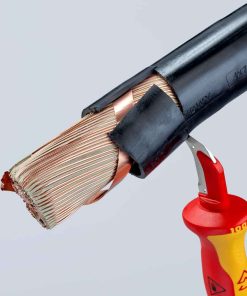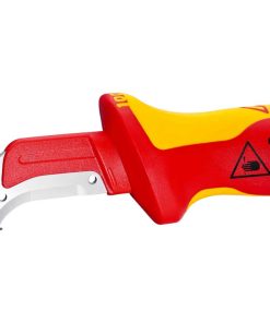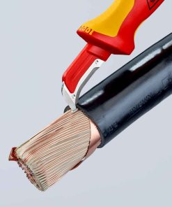 Il coltello spelacavi Knipex 98 55 è dotato di una lama fissa, in acciaio inossidabile, a forma di falce con pattino di guida all’estremità della lama. La sua impugnatura di forma ergonomica con pratica protezione antislittamento lo rende un’attrezzo sicuro con una buona trasmissione di forza. Nessun danneggiamento all’isolamento del conduttore.