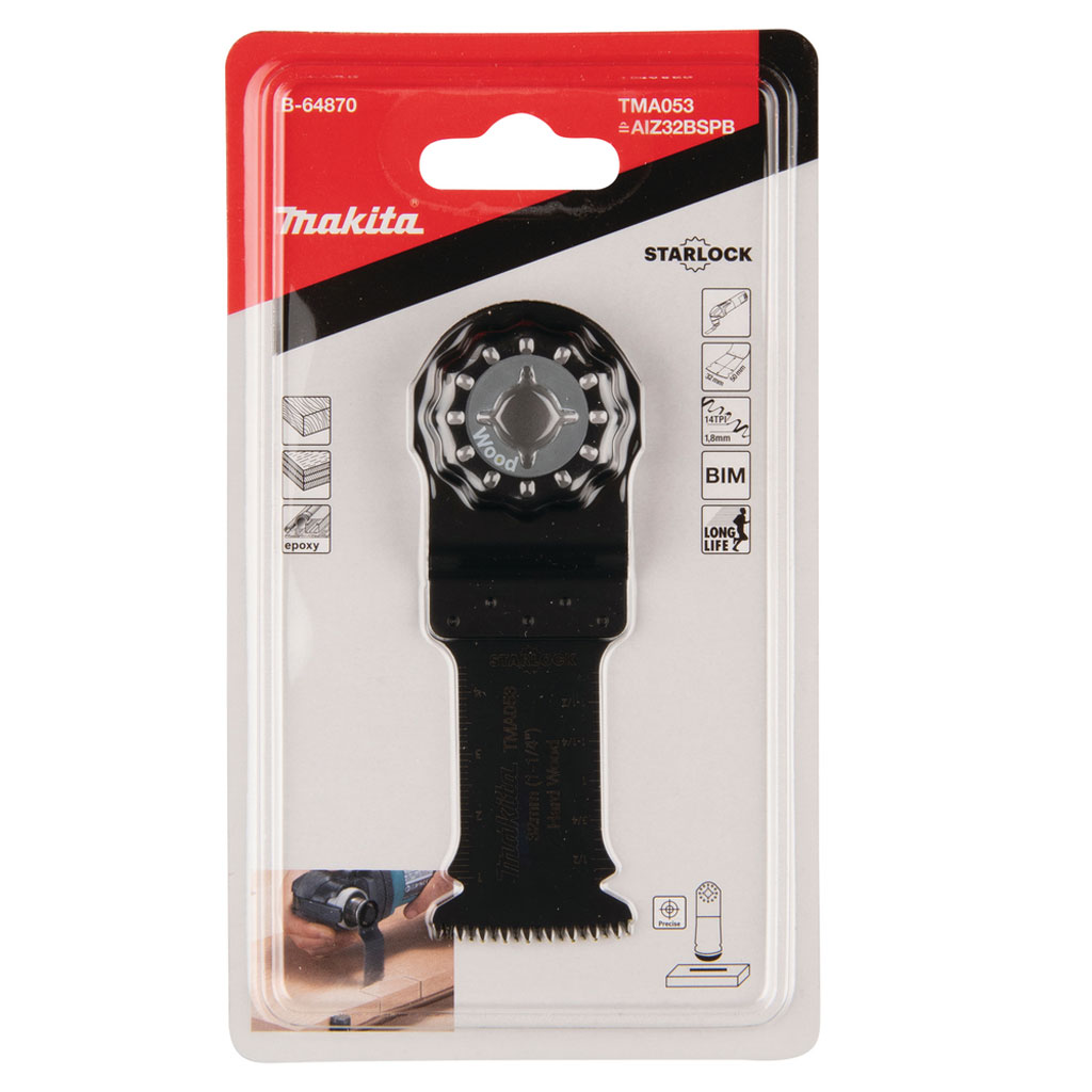 Makita B-64870 è una Lama Starlock da 32 mm di larghezza e 50 mm di lunghezza per applicazioni di taglio di legno.