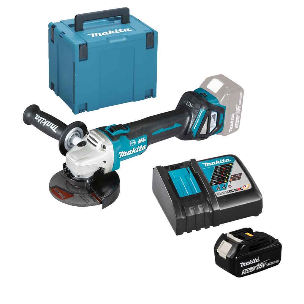 Makita DGA513ZJKIT include 1 Batteria 18V 5Ah, 1 Carica Batteria rapido singolo DC18RC, Disco abrasivo Ø125, Impugnatura AVT , Copri Disco, Chiave di servizio, Valigia Makpac tipo 4 con preformato.