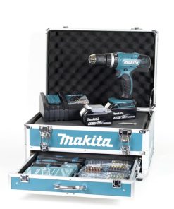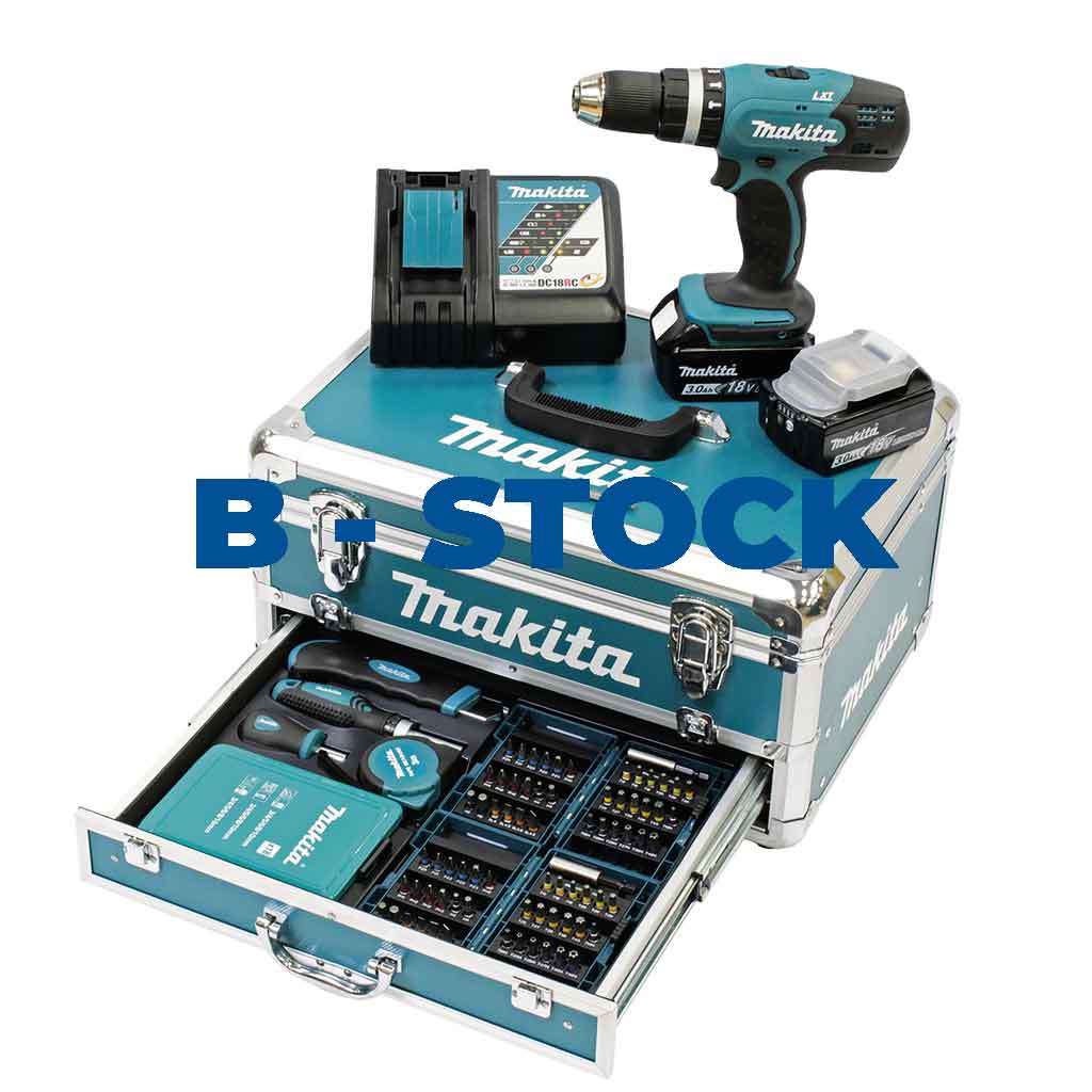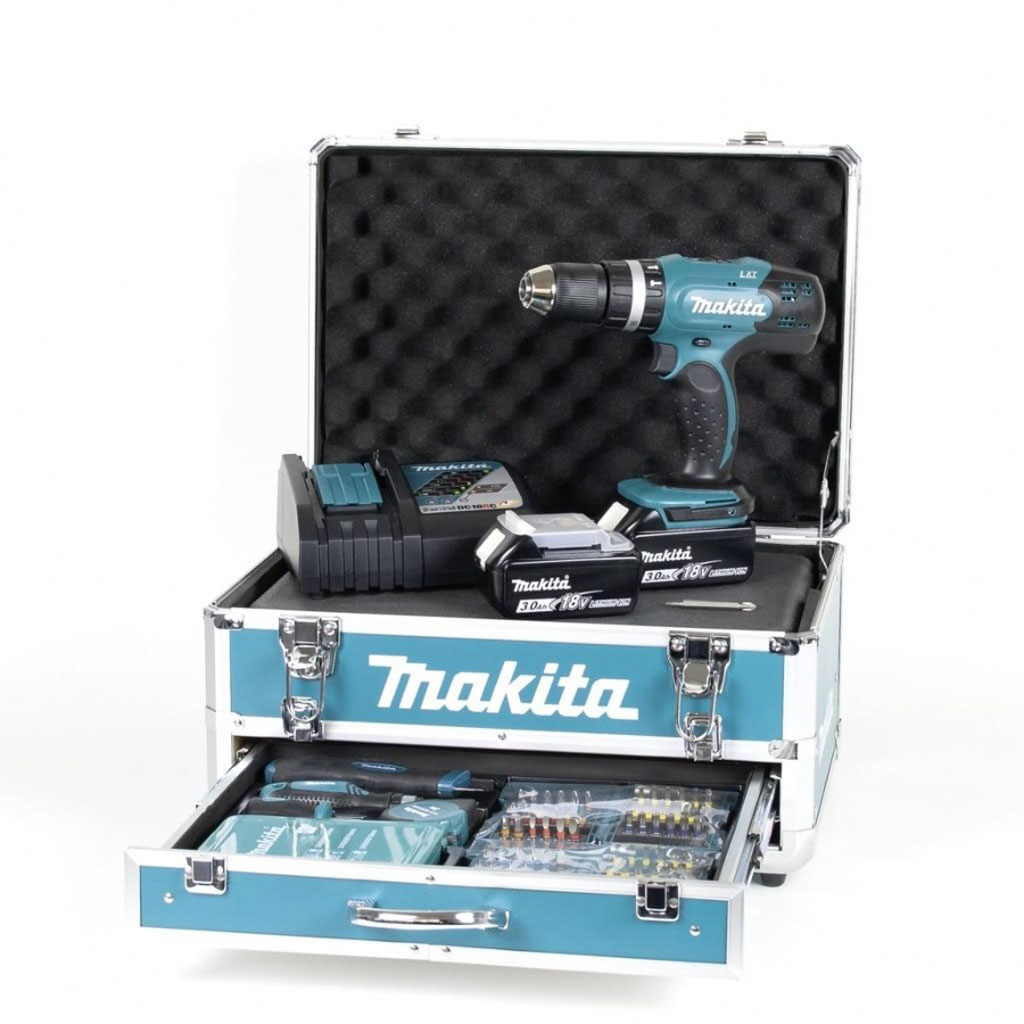 Makita DHP453RFX2 include 2 batterie 18V 3 Ah BL1830B, caricabatterie rapido DC18RC, 96 Accessori (Inserti, Punte, Utensili manuali) e Valigia.