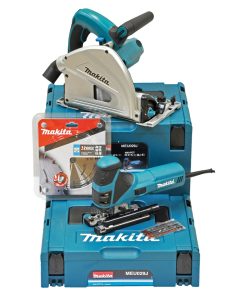 Il kit Makita MEU029JP è composto dalla sega ad affondamento a corrente SP6000 e il seghetto alternativo 4351FCTJ in valigie Makpac.