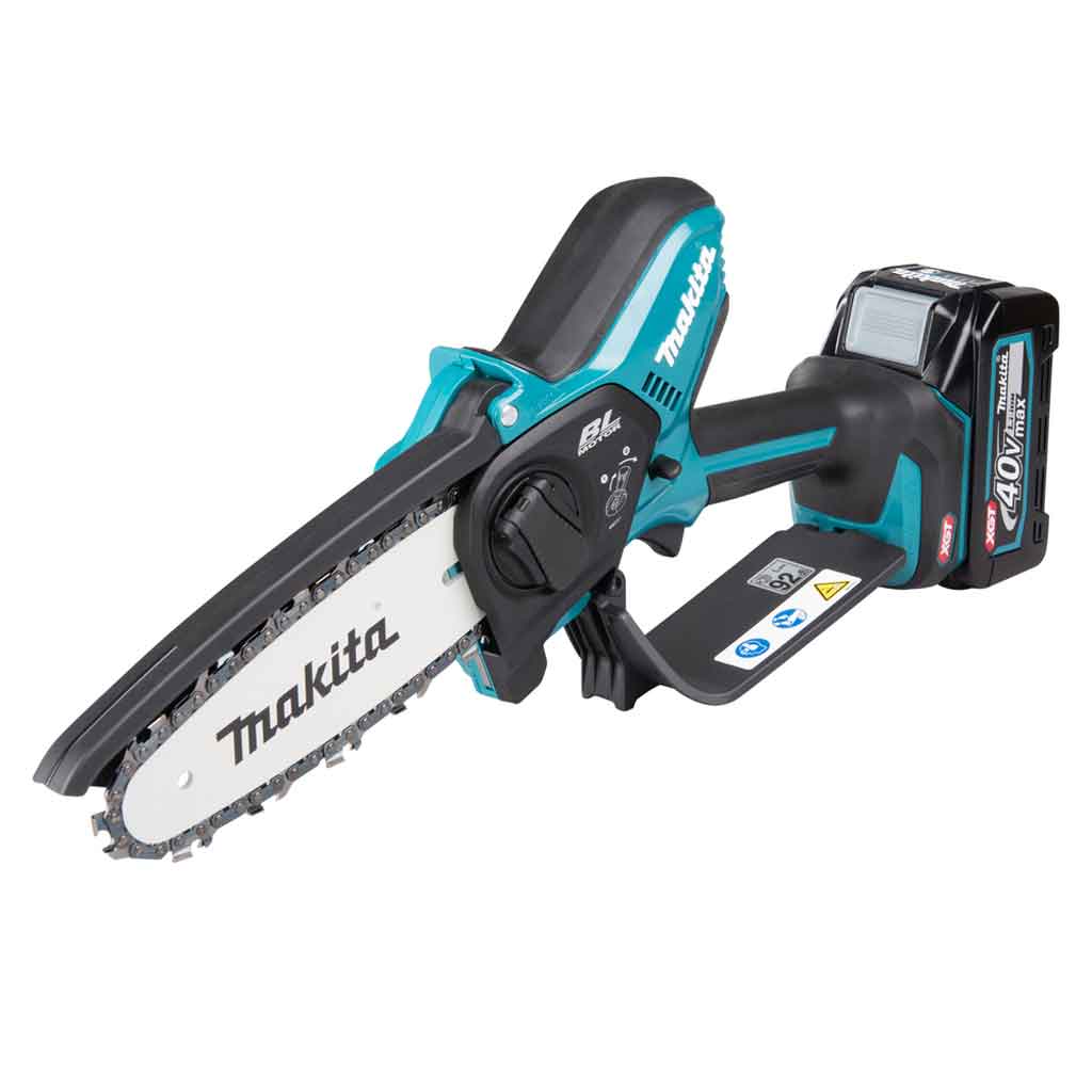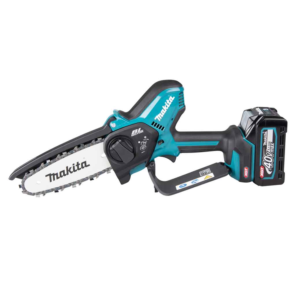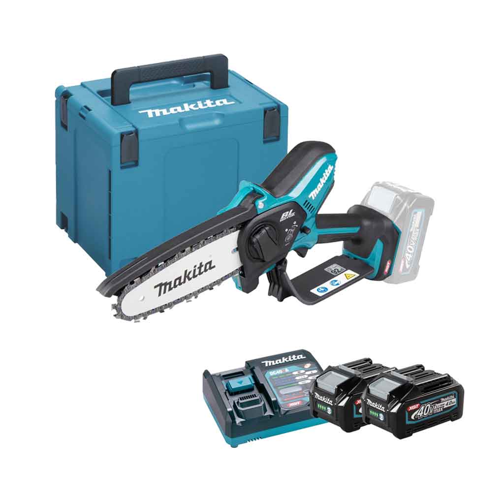 Makita UC029GM201 include N.2 Batterie 40V 4Ah, Carica Batteria singolo DC40RA, Barra da 15 cm, catena a 32 maglie, olio per catena, utensile per affilatura e valigetta Makpac tipo 4 con preformato.