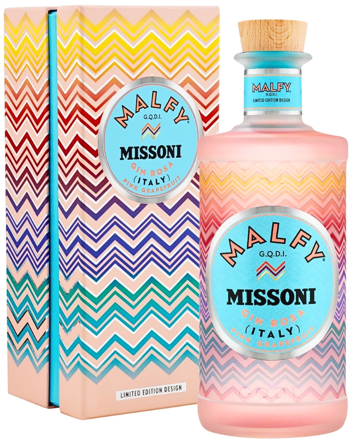 Limited Edition del famoso Malfy Rosa che sigla con questa bottiglia una collaborazione esclusiva con la casa di moda italiana Missoni. Questa edizione limitata presenta l’iconico motivo a zigzag di Missoni nei colori del tramonto, rosa e azzurro con dettagli in argento, avvolgendo la bottiglia e l’astuccio in un design distintivo. Malfy Gin è prodotto da Torino Distillati, situata a Moncalieri, in Piemonte, una distilleria con una lunga tradizione nella produzione di liquori di alta qualità. Il gin è realizzato utilizzando pompelmo rosa di Sicilia e rabarbaro, infusi insieme a ginepro e altre botaniche italiane, seguendo un processo di distillazione a freddo che preserva gli aromi freschi e intensi degli ingredienti.
