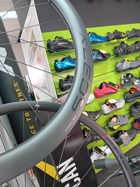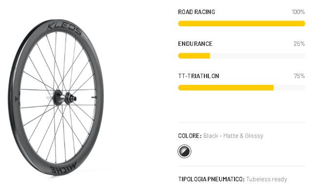 I raggi in acciaio inox a doppio spessore disposti secondo lo schema 16+8 incrociato/radiale prevedono sezioni aero differenti tra ruota anteriore e posteriore. Una innovazione che assieme all’Aero Blade è stata messa a punto a seguito dei dati raccolti in galleria del vento.