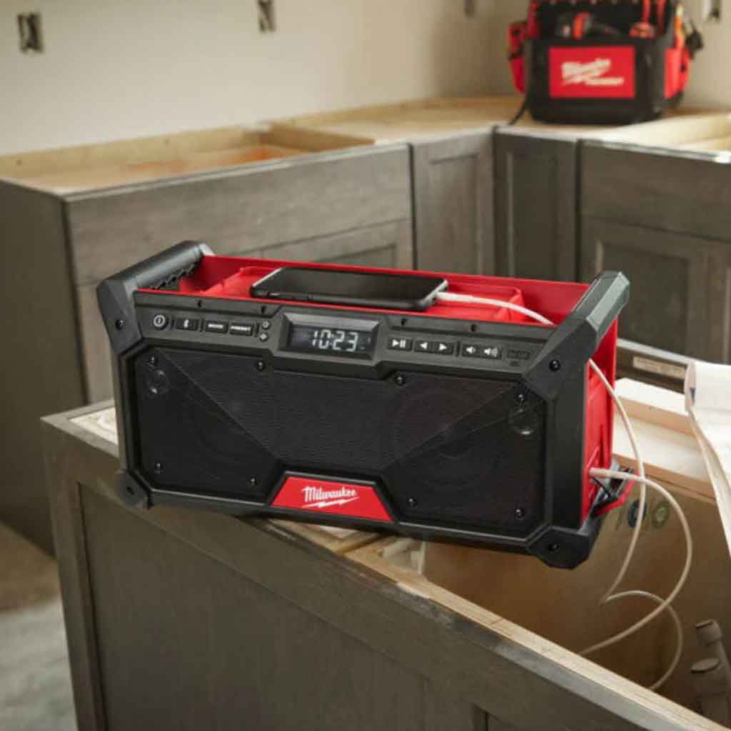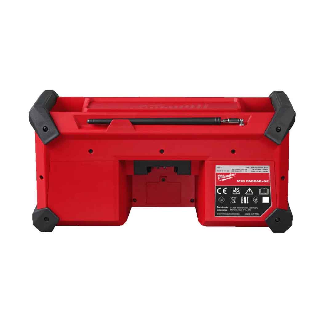 La Radio DAB+ Milwaukee M18 RADDAB+G2-0 ha un sistema sonoro ad alte prestazioni con un doppio woofer da 8,89cm e doppi tweeter per un suono chiaro e bilanciato. Dotato di sintonizzatore radio DAB+ e AM/FM ,per massima ricezione di segnale e visualizzazione di informazioni aggiuntive, Connettività Bluetooth ed equalizzatore personalizzabile per una migliore qualità del suono e 18 stazioni preimpostate. La presa di corrente USB-C protetta consente di ricaricare i dispositivi elettronici sia quando si utilizza la radio a corrente, sia a batteria