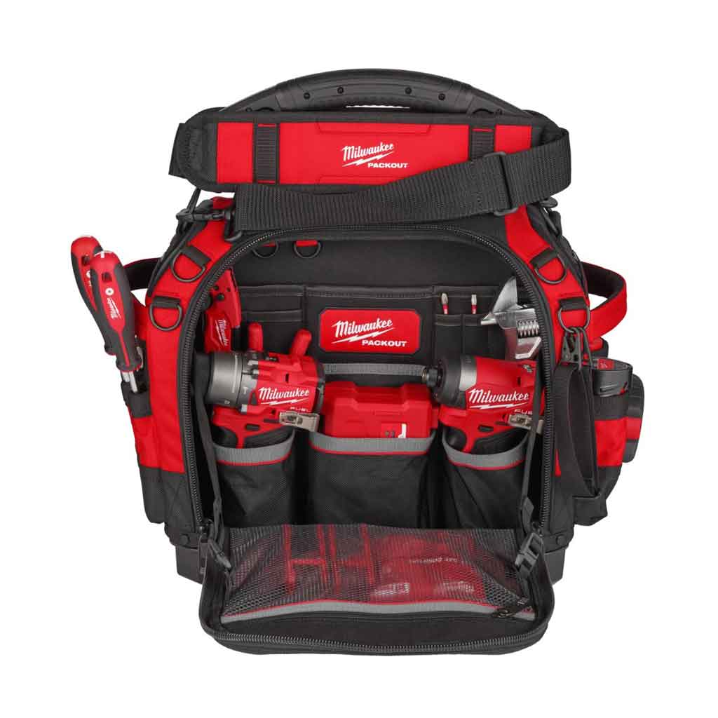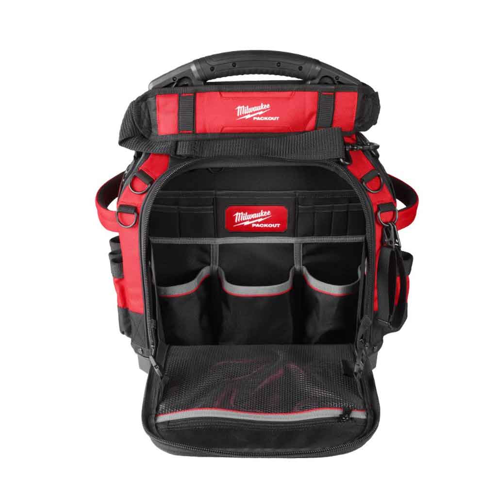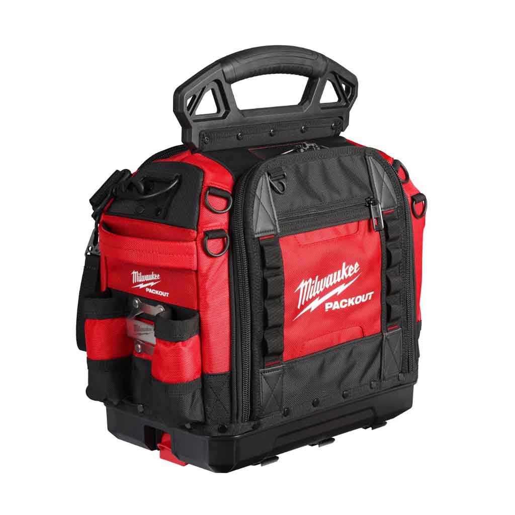 Milwaukee PACKOUT 38CM CLOSED TOTE TOOL BAG fa parte del sistema di stoccaggio modulare PACKOUT™ con base Packout che protegge dall’umidità e detriti.
