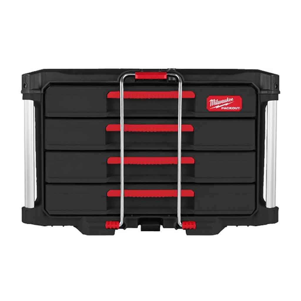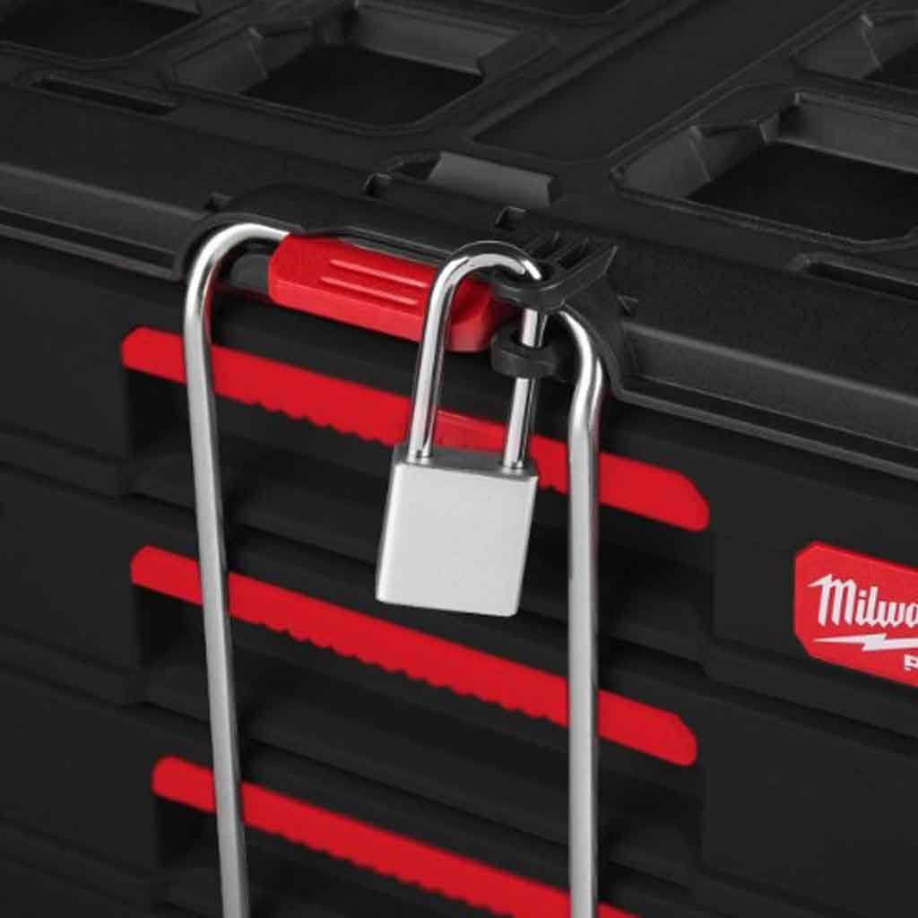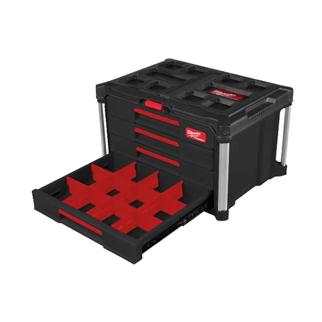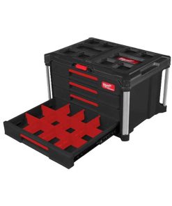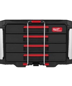 La cassettiera porta utensili con 4 cassetti PACKOUT Milwaukee 4932493189 ha una capacità di carico di 22 Kg con guide con cuscinetti a sfera in acciaio che supportano fino a 11 kg di peso per cassetto. Facile accesso ai tuoi utensili, senza rimuovere nessun elemento e la barra di sicurezza impedisce l’apertura indesiderata dei cassetti durante il transito e permette di chiudere cassetti con lucchetto.
