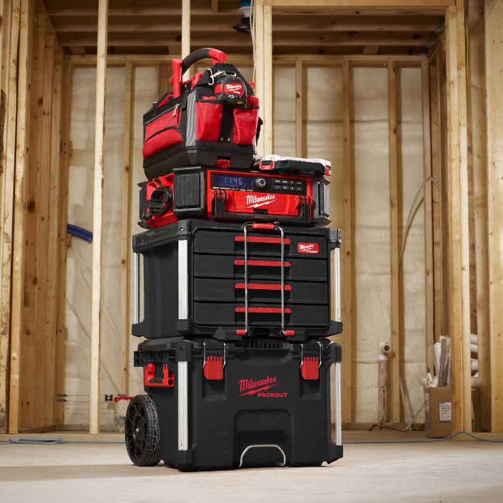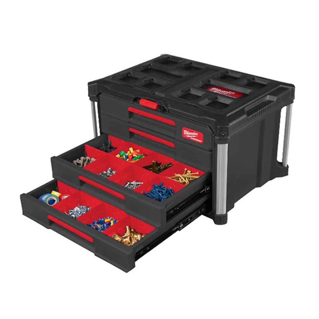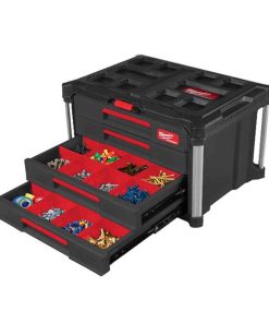La cassettiera porta utensili porta utensili PACKOUT Milwaukee è costruito con polimeri estremamente resistenti per massima durata e rinforzi laterali in alluminio. Ogni cassettiera viene fornita con una serie di divisori a regolazione rapida che consentono agli utenti di personalizzare la disposizione interna dei cassetti.