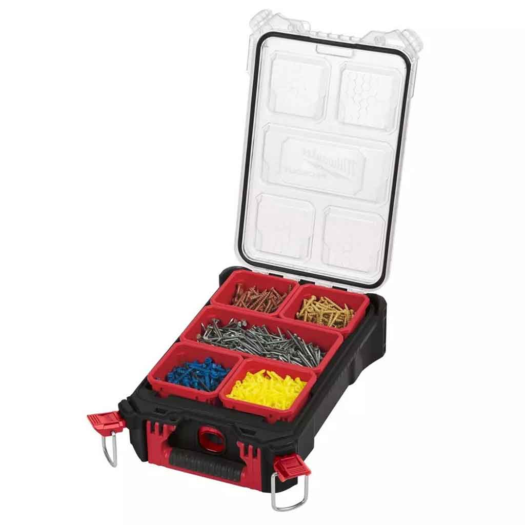 La valigia porta minuteria PACKOUT Milwaukee 4932464083 è ideale per organizzare le proprie minuterie in modo versatile. E’ dotata di 5 comparti removibili con coperchio trasparente in policarbonato con incastri che bloccano l’interno in modo che non si disperda durante il trasporto.