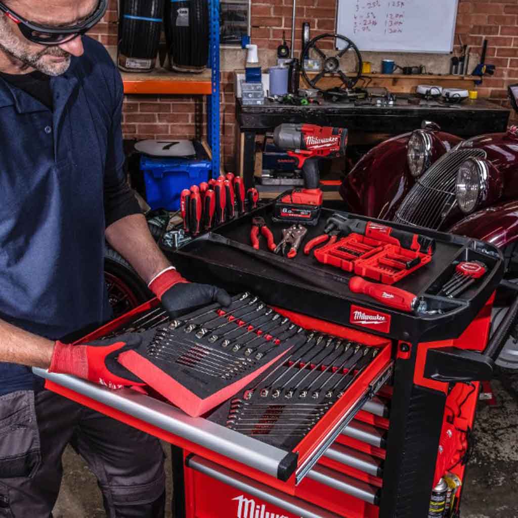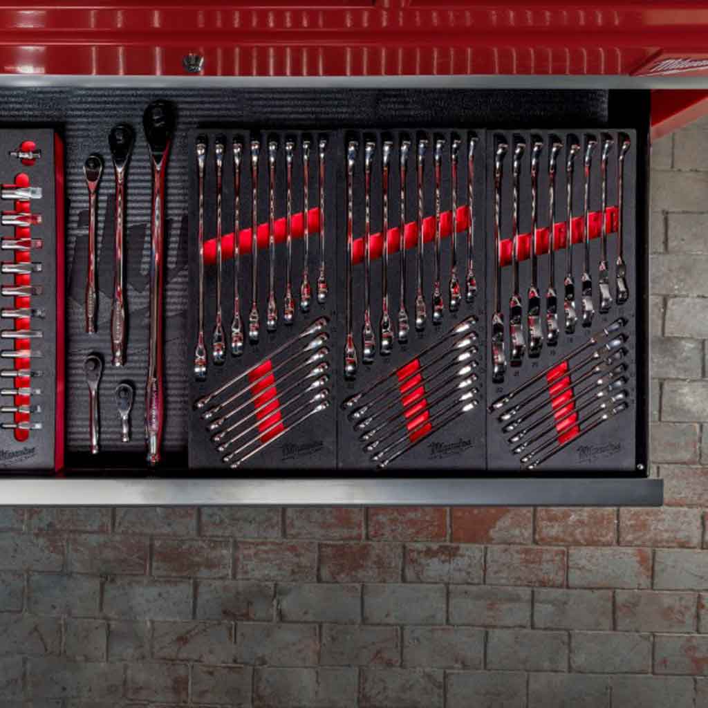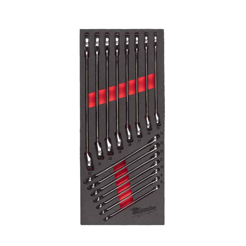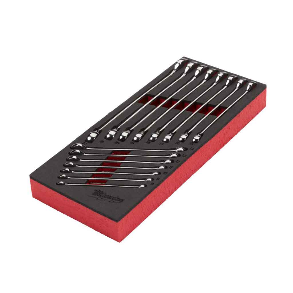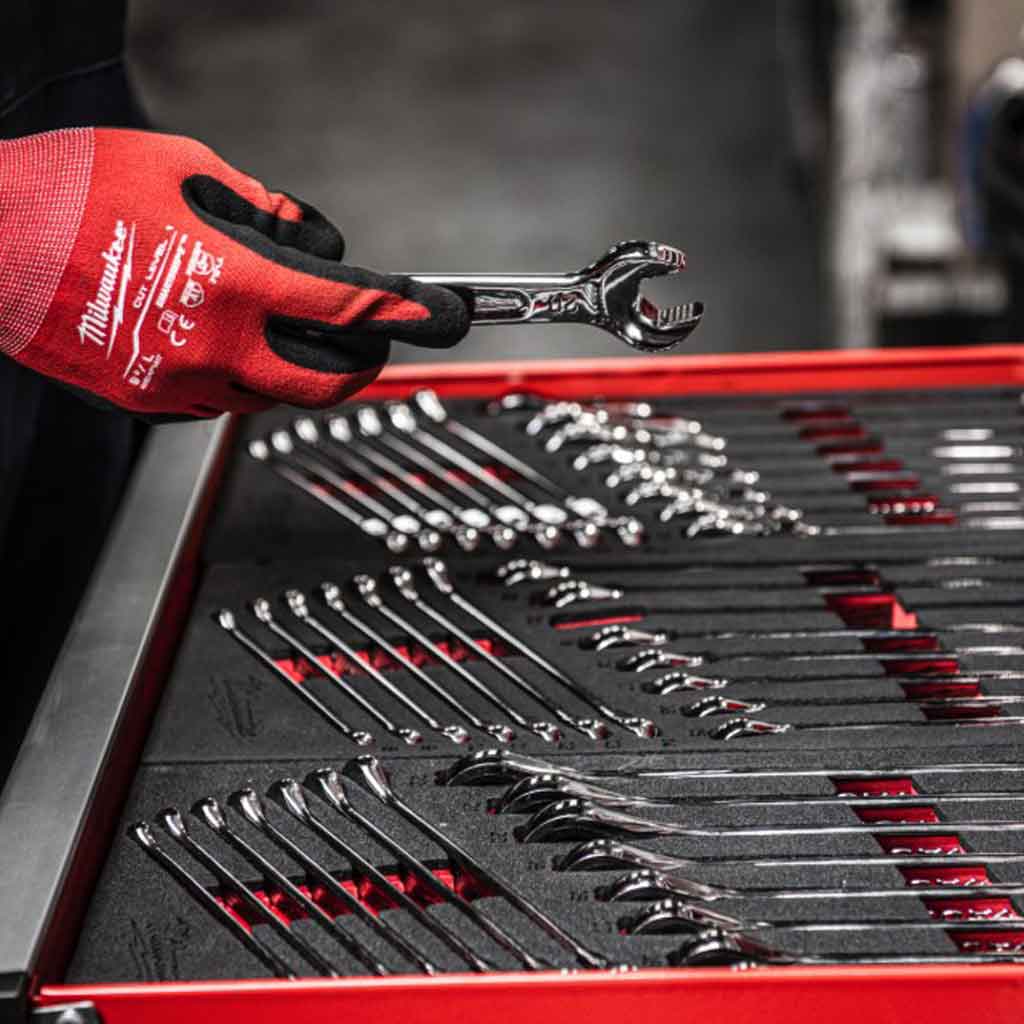 Il Set Chiavi combinate Milwaukee è composto da 15 pezzi con chiavi combinate MAXBITE in un modulo morbido per una facile conservazione nei carrelli portautensili. L’apertura MAX BITE™ riduce le flessione e la scrostatura con un massimo comfort grazie al design arrotondato.
