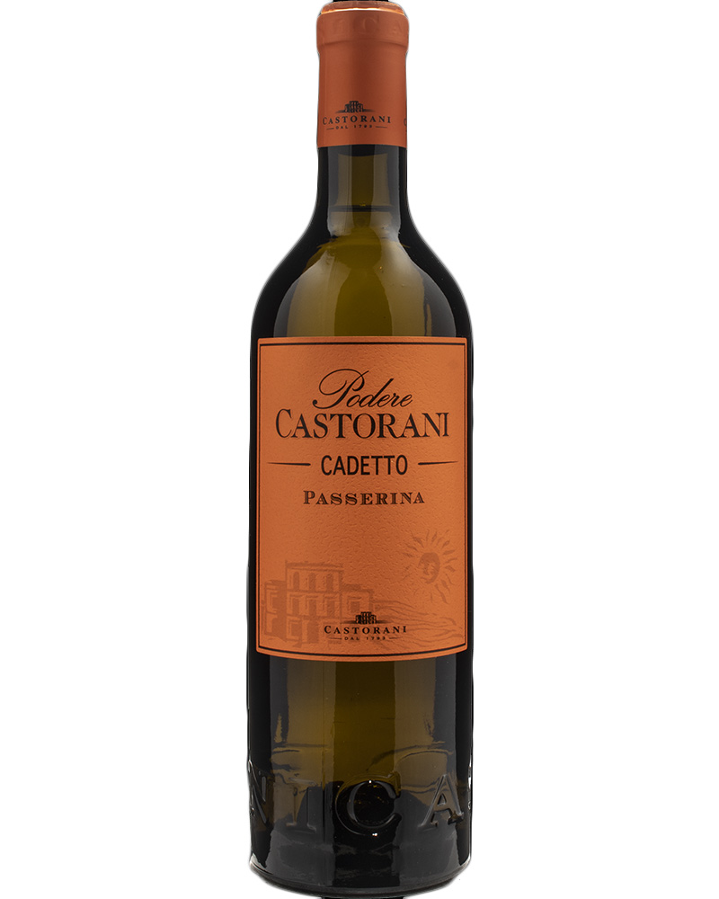 Passerina Colline Pescaresi IGT della linea base “Cadetto” dell’azienda Castorani di Jarno Trulli, realizzato da uve passerina di superba qualità, coltivate a spalliera, nel comune di Alanno, in Provincia di Pescara dove i vigneti, incastonati tra il parco Nazionale della Majella e la vicina costa adriatica, godono di un’ottima esposizione al sole e ai venti notturni, e di escursioni termiche tra il giorno e la notte che donano alle uve caratteristiche uniche e preziose. Viene affinato “sur lies”, 3 mesi in vasca di cemento.