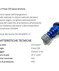 Questa presa monofase CEE 2P+T 32A bassa tensione è progettata per offrire massima praticità e affidabilità nell’utilizzo professionale.