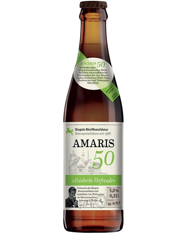Birra bionda Pils, realizzata ad Ausburg, in Germania, presso uno dei più antichi birrifici al mondo: il birrificio Riegele, attivo da prima del 1800. L’Amaris appartiene alla linea di birre artigianali crude non pastorizzate, rientrando in una gamma produttiva originale ed estremamente eterogenea. Il gusto fresco ed amaro, è dovuto all’utilizzo di quattro varietà diverse di luppolo: Hallertauer, Opal, Tettnager, Hersbrucker. In aggiunta, in pieno stile Nord – americano, ci sono cinquanta aromi diversi miscelati al malto.