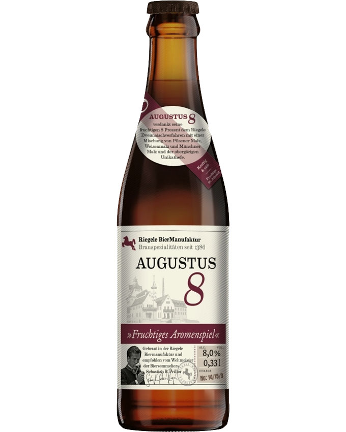 Birra scura Doppelbock, realizzata ad Ausburg, in Germania, presso uno dei più antichi birrifici al mondo: il birrificio Riegele, attivo da prima del 1800. L’Augustus appartiene alla linea di birre artigianali crude non pastorizzate, rientrando in una gamma produttiva originale ed estremamente eterogenea. Il suo sapore particolare e la sua natura fortemente aromatica, deriva dalla combinazione di diversi malti tra cui: Weizen, Pilsener, Munchner.