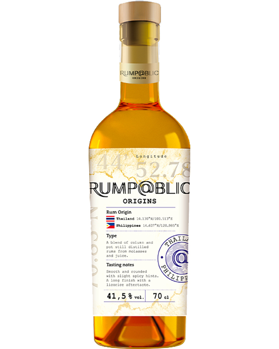 Rump@blic Origins Thailandia & Filippine è un’interessante combinazione di rum provenienti dalla Thailandia e dalle Filippine, ottenuti sia da melassa che da succo di canna, e distillati sia in pot still che in column still. Il distillato esprime in modo eccellente la diversità e la particolarità dei rum del sudest asiatico, offrendo un’esperienza gustativa unica. La linea Rump@blic Origins comprende una selezione di rum provenienti da diverse parti del mondo, ognuno caratterizzato da metodi di distillazione e invecchiamento unici.