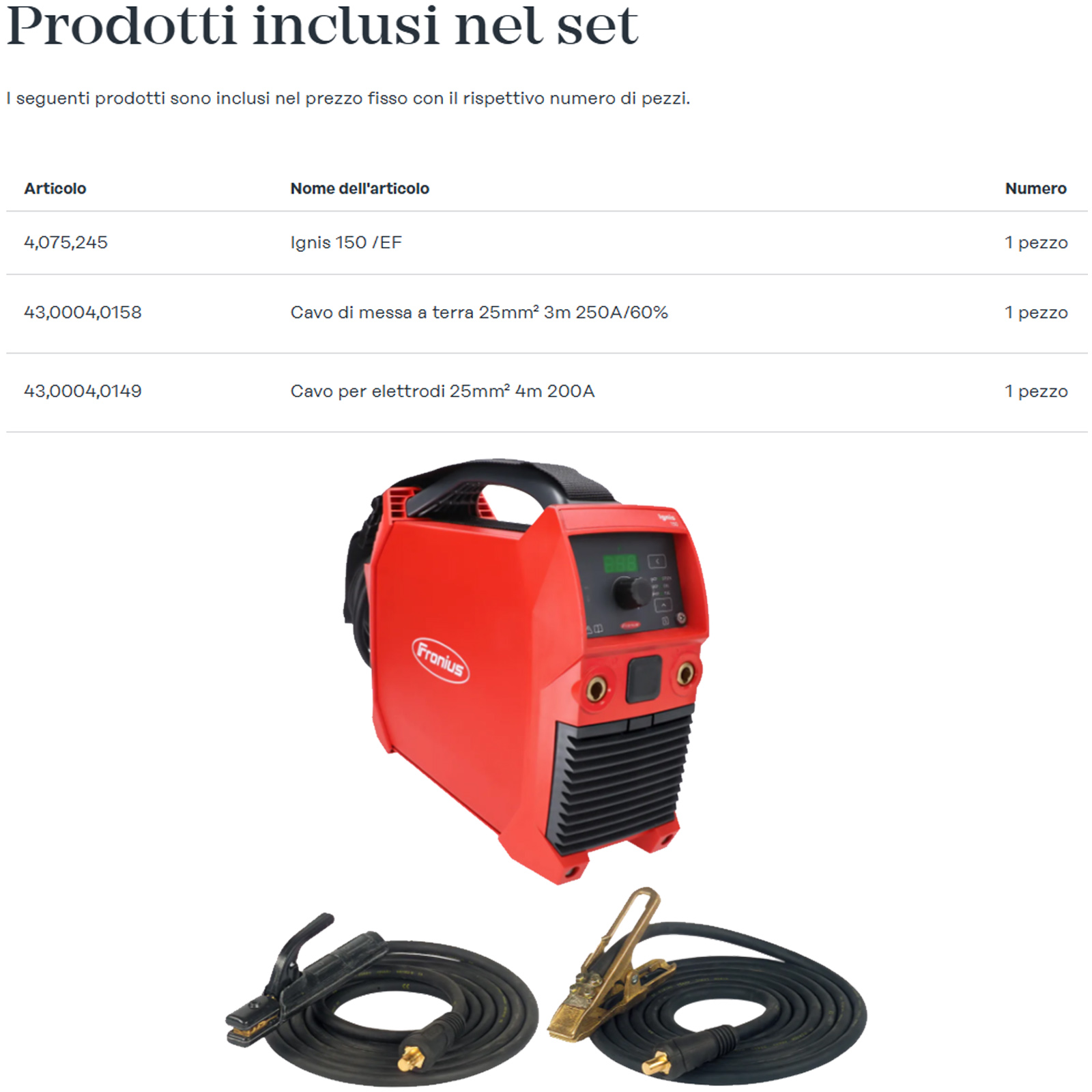 La saldatrice Ignis 150 EF in kit con cavi e pinze rappresenta una soluzione di alta qualità per professionisti e appassionati del settore della saldatura.