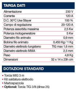 MMA con elettrodi rivestiti rutili, basici ed inox fino al diametro di 2,5 mm e tensione a vuoto 60 V;