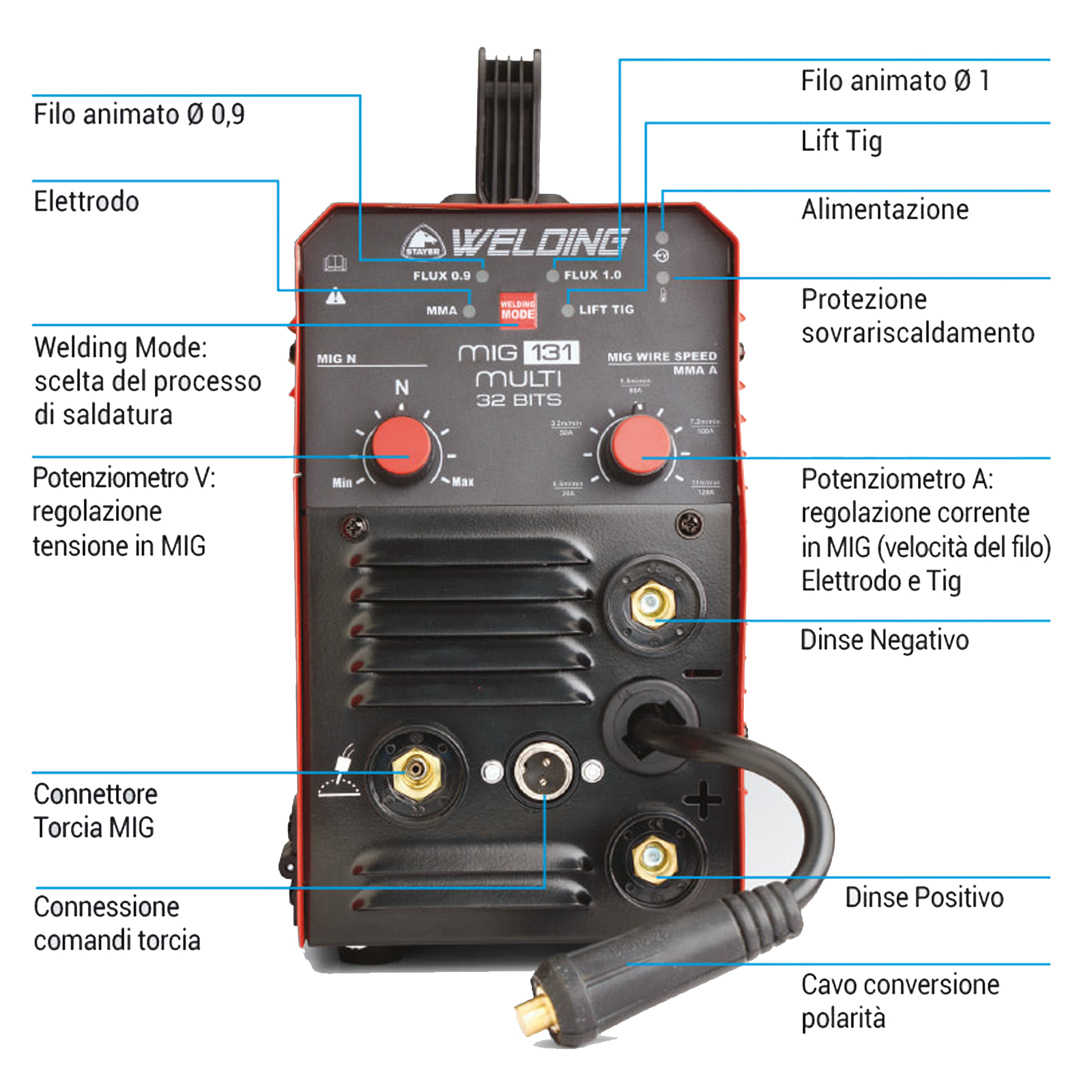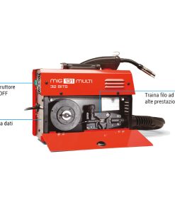 La tecnologia inverter multi-processo è gestita da un microprocessore integrato che consente lavori di saldatura MIG con filo animato (Flux Core) dal diametro 0,9 con regolazione della velocità di scorrimento proporzionale alla corrente di saldatura e della tensione per controllare il grado di penetrazione del cordone;