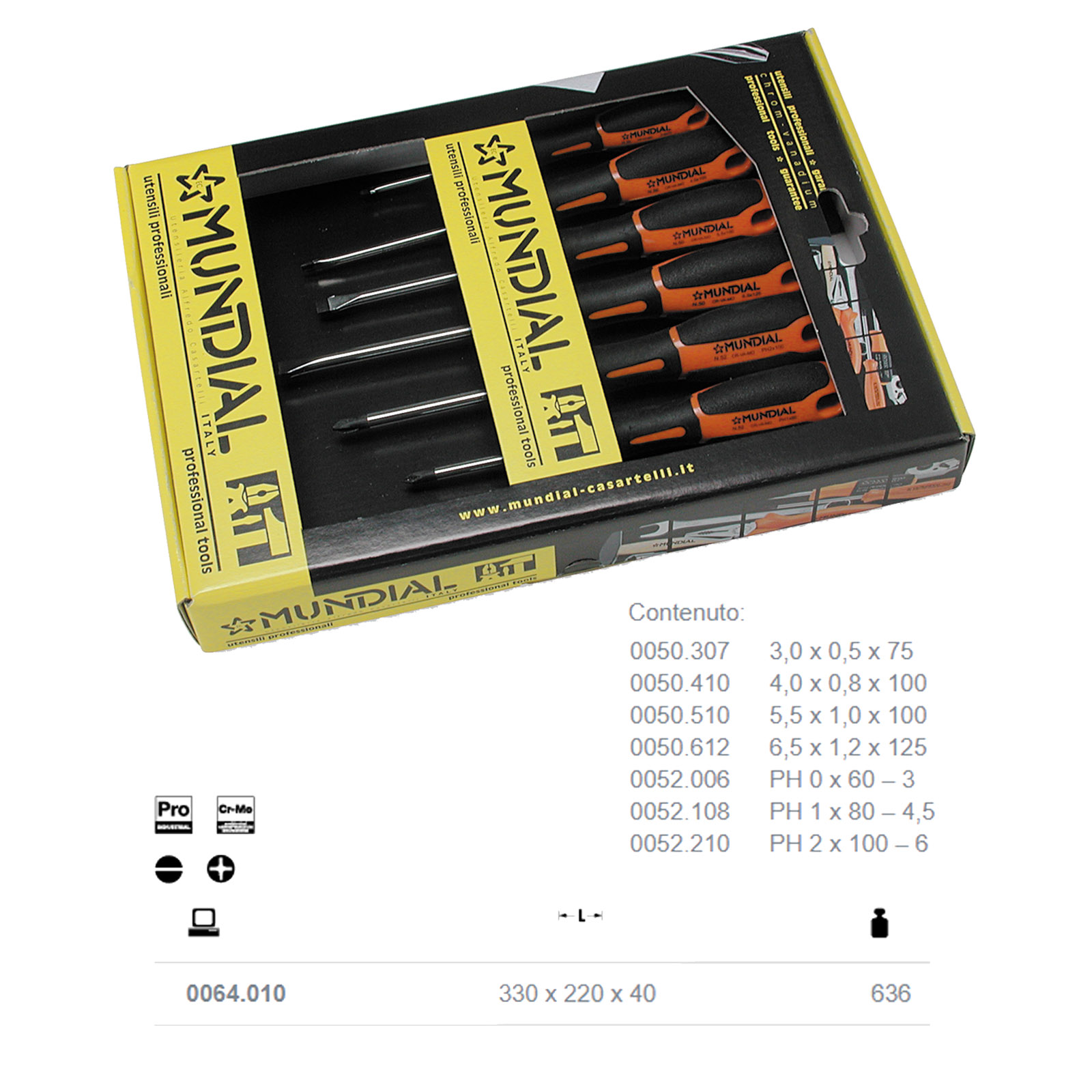 Il set è composto da 7 giraviti, di cui 4 giraviti per viti ad intaglio-meccanici e 3 giraviti per viti ad intaglio-croce tipo Phillips.