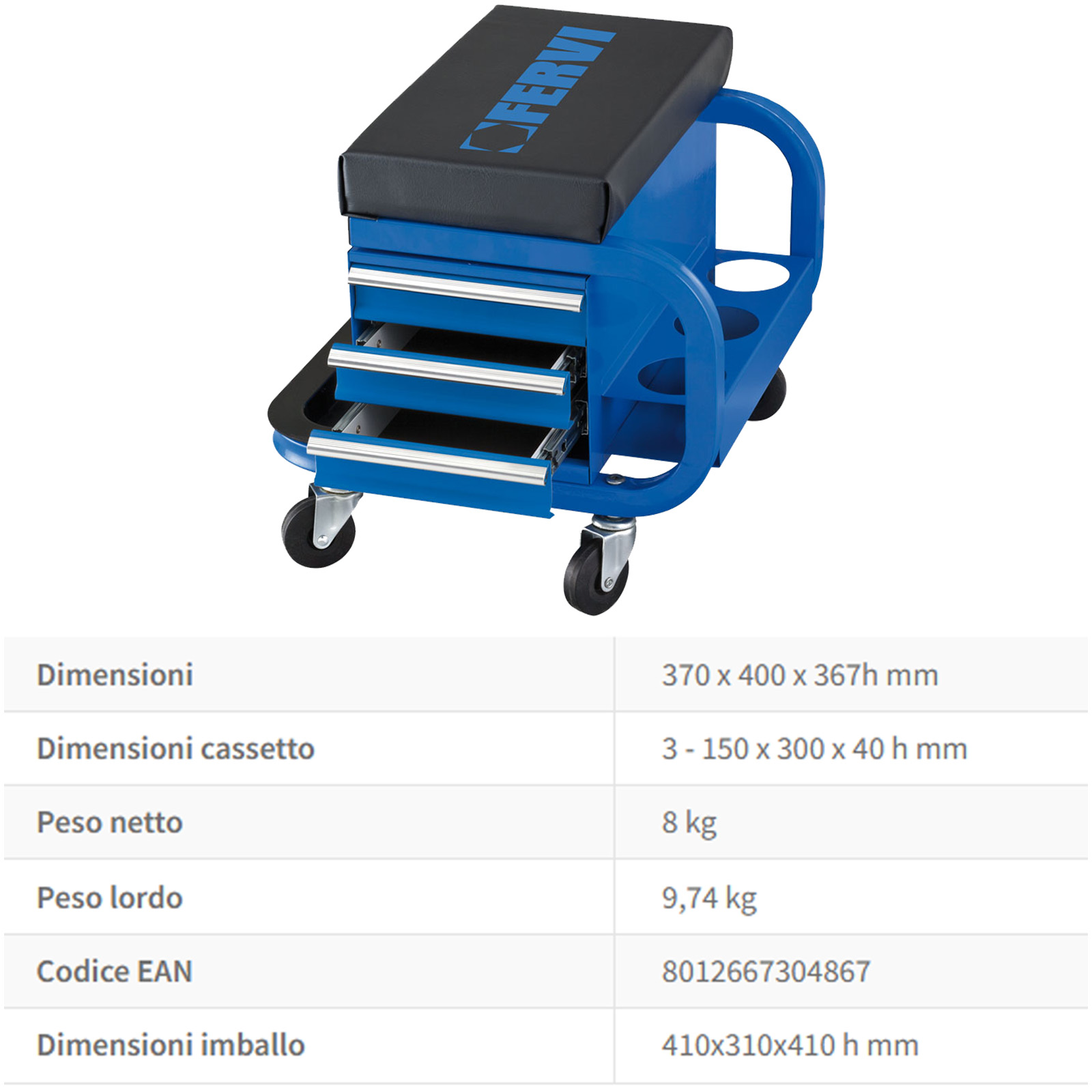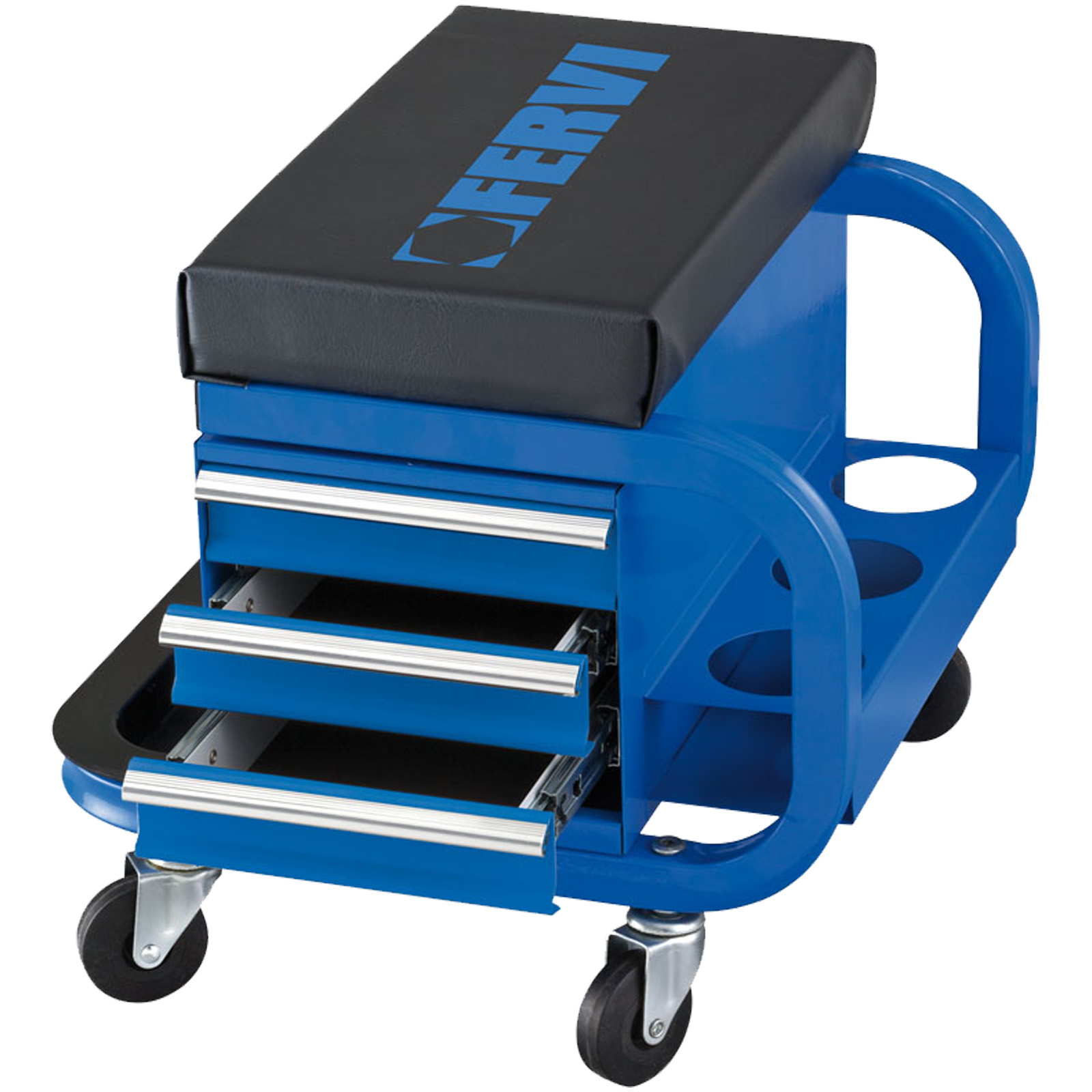 Lo Sgabello Imbottito per Officina con Ruote Pivottanti, 3 Cassetti Porta Attrezzi/Utensili, Piano Portaminuterie e 3 porta bombolette spray 0645/CC, è un utensile essenziale per qualsiasi meccanico professionista o appassionato di bricolage.