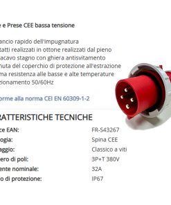 Questa spina trifase CEE 3P+T 32A bassa tensione è progettata per offrire massima praticità e affidabilità nell’utilizzo professionale.