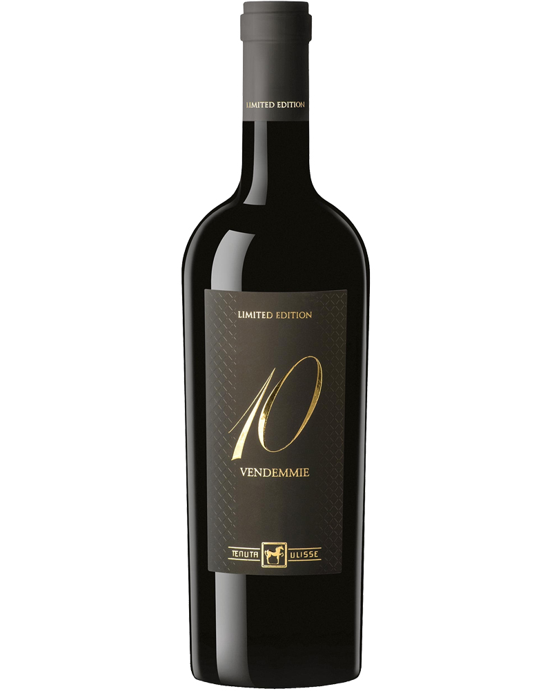 “10 Vendemmie” è una edizione limitata di vino nata da 10 grandi annate di Montepulciano, ottenute dalle migliori uve e dai migliori terroir della Tenuta Ulisse, rinomata cantina abruzzese. Realizzato interamente con uve Montepulciano, il processo di vinificazione prevede una fermentazione in acciaio con una macerazione di 15-20 giorni a una temperatura di 24-26°C. Una parte del vino viene poi affinata in pregiati barrique di rovere francese per 12 mesi.