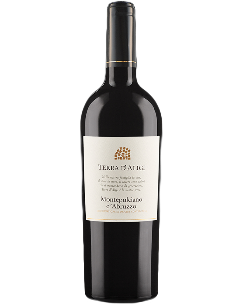 Vino rosso Montepulciano d’Abruzzo DOC prodotto da cantina Terra d’Aligi con 100% di uva Montepulciano proveniente da vigneti di proprietà nei colli della Val di Sangro in Abruzzo. Grande classico della tradizione abruzzese e della prima linea di produzione della cantina. La vinificazione avviene con una lunga macerazione sulle bucce a temperatura controllata e poi si procede all’affinamento di 12 mesi in grandi botti di rovere di Slavonia e un breve periodo in bottiglia.