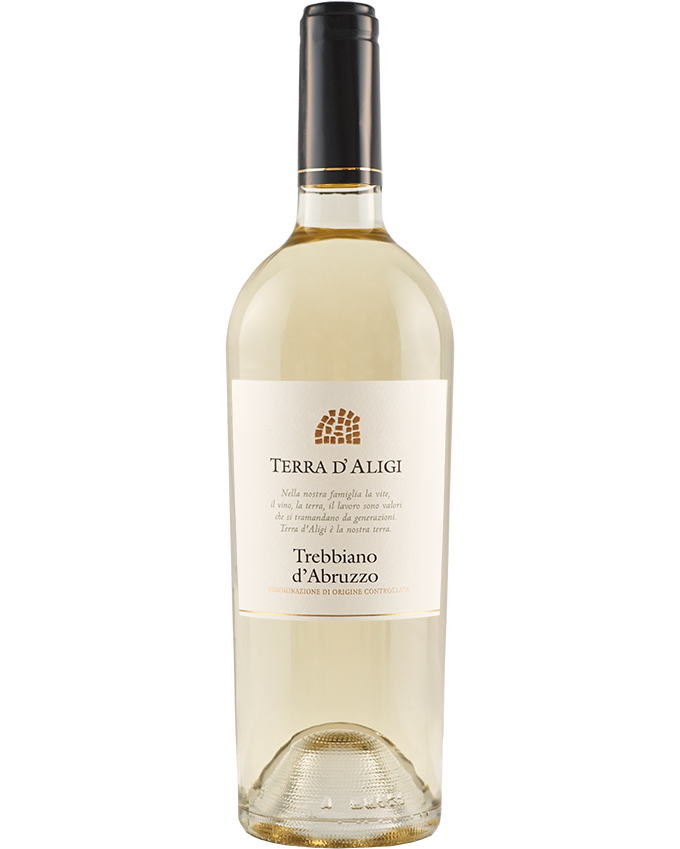 Trebbiano d’Abruzzo DOC realizzato dall’azienda Terra d’Aligi, situata in una delle più belle zone vinicole della provincia di Chieti in Abruzzo. Il vino Trebbiano di Terra d’Aligi di è si caratterizza per il suo profilo organolettico originale e tradizionale al tempo stesso. bianco fresco, fermo e secco, vinificato da uve Trebbiano d’Abruzzo 100% provenienti da vigneti di proprietà, nei colli della Val di Sangro, allevati a tendone e con macerazione a freddo del pigiato e fermentazione in acciaio a temperatura controllata. Segue un breve affinamento in bottiglia.