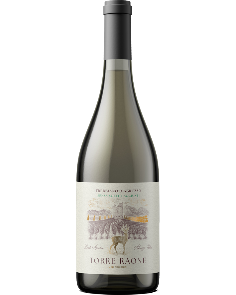Vino Bianco Biologico Senza Solfiti Trebbiano d’Abruzzo Doc della cantina Torre Raone. Vino fresco prodotto da uve Trebbiano 100% provenienti da coltivazioni biologiche. La vinificazione avviene con un processo di decantazione statica a freddo del mosto fiore per 24 ore per poi passare alla fermentazione alcolica a temperatura controllata a 14 °C in contenitori d’acciaio. Fermentazione malo-lattica spontanea, chiarifica organica, breve stoccaggio in acciaio e in bottiglia di almeno 3-4 mesi.