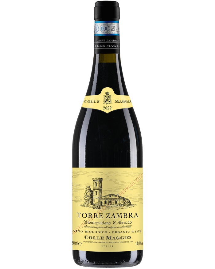 Vino Montepulciano d’Abruzzo DOC cantina Torre Zambra, situata a Villamagna, in Abruzzo. Questo vino è ottenuto da uve Montepulciano coltivate in regime biologico su colline esposte a sud con suoli argillosi, che conferiscono al vino una struttura profonda e complessa. La vinificazione prevede una fermentazione in vasche di acciaio inox, seguita da un breve affinamento in botti di rovere nuove e usate, che aggiunge complessità e struttura al vino.