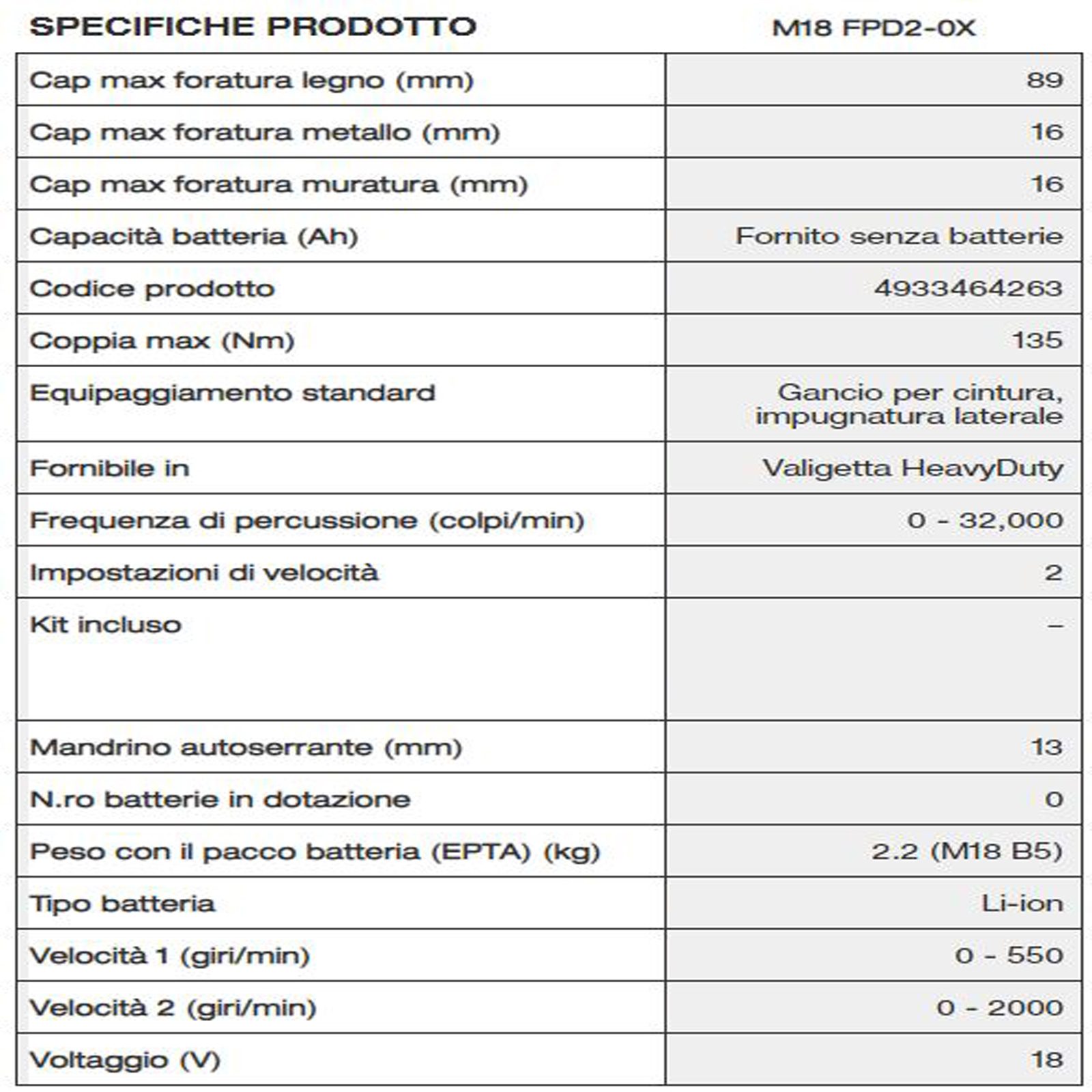 Il trapano avvitatore modello M18 FPD2 dotato di percussione con il miglior rapporto dimensioni/potenza è uno strumento al vertice della categoria per potenza e coppia erogata.