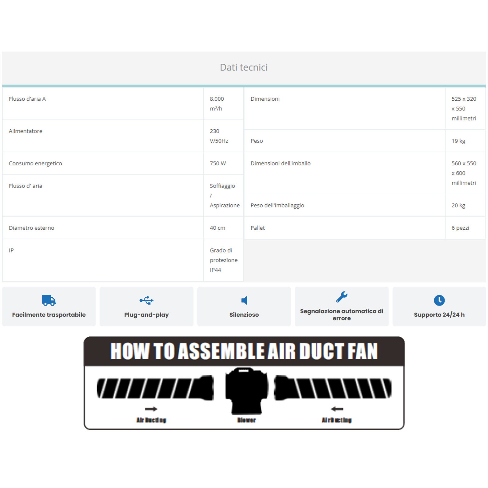 • Portata 8.000 m³/h e prevalenza di 490 Pa ideale in spazi confinati e pozzetti
